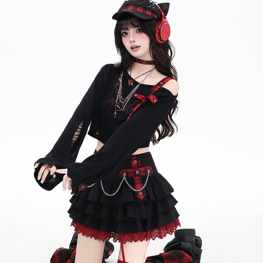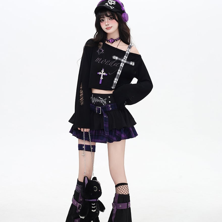関連キーワード: #サブカル系 #地雷系 #トップス #長袖 #パンク #ロック #Y2K #原宿ファッション #ダークファッション #闇かわいい #病みかわいい #チェック柄 #ダメージ加工 #肌見せ #アシンメトリー #クロップド丈