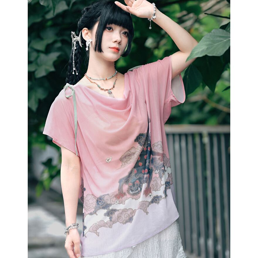 関連キーワード: #チャイナ風 #中華服 #中華系ファッション #サブカル #地雷系 #トップス #シャツ #メッシュ #シアー #プリント #神獣 #ピンク #夏服 #レイヤード #ドレープ #ゆったり #古怪舎 #バックシャン