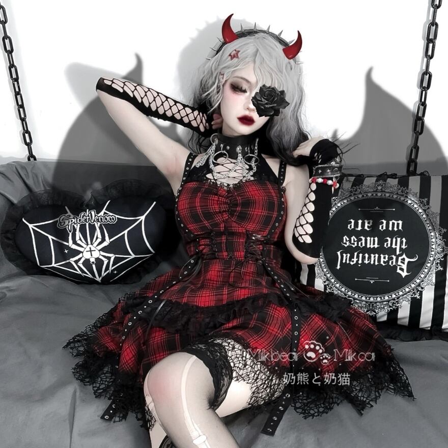王道の赤×黒タータンチェックに、黒レースと編み上げを組み合わせた最強のデザイン。フィッシュネットやクロスストラップが、パンクで退廃的な雰囲気を加速させます。
