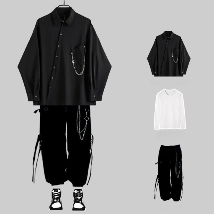 ストリートに映える、クールなセットアップ。ゴシックなディテールと、ゆったりとしたシルエットが、あなたの個性を引き立てる。ライブやイベントで、周りの視線を独り占めに。