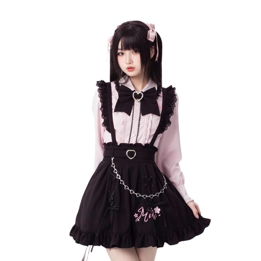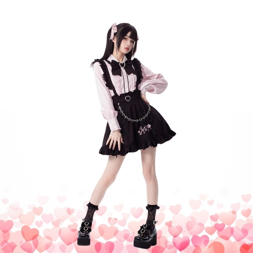 ロリィタの甘さと地雷系のクールさが絶妙に融合した長袖ブラウスとフリルやリボンといった甘めなスカートのセットアップになります。地雷系ならではの甘辛MIXデザインが魅力です。