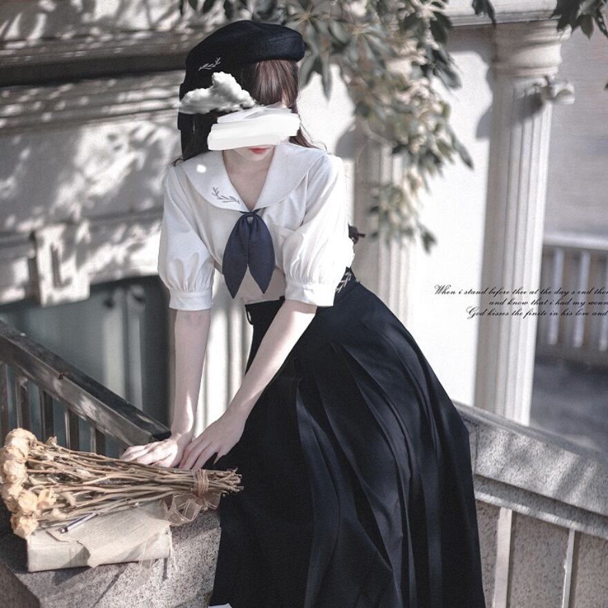 ブラウスは柔らかな生地に、フリルと刺繍で彩られた大きめのセーラー襟が特徴です。取り外し可能なリボンタイで表情を変えられます。