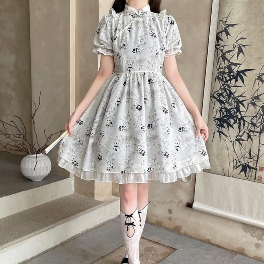 パンダワンピ 中華ロリィタ 半袖ワンピース パンダ柄 チャイナ風