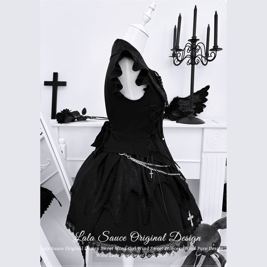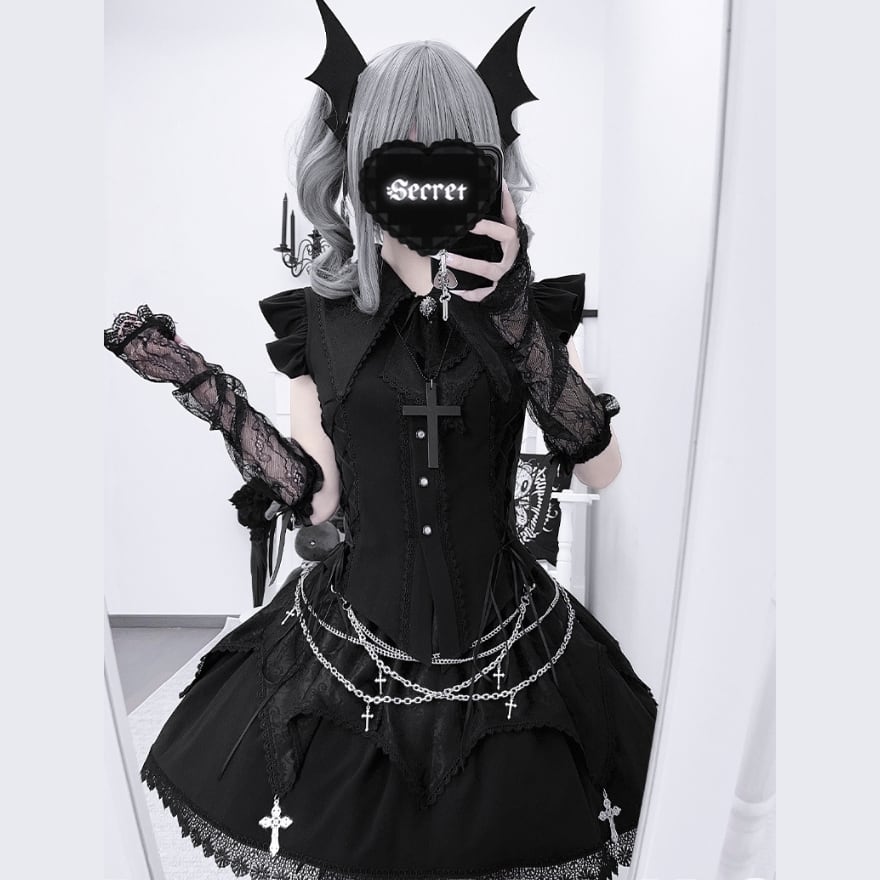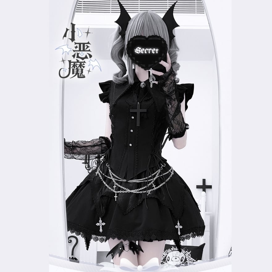 甘く危険な、私の秘密。地雷系とゴスロリの要素が融合した、甘辛MIXのセットアップ。繊細なレースとハードなストラップが織りなす、反骨的でいてドーリーな存在感が、あなたの推し活やライブを最高に特別な時間にする。