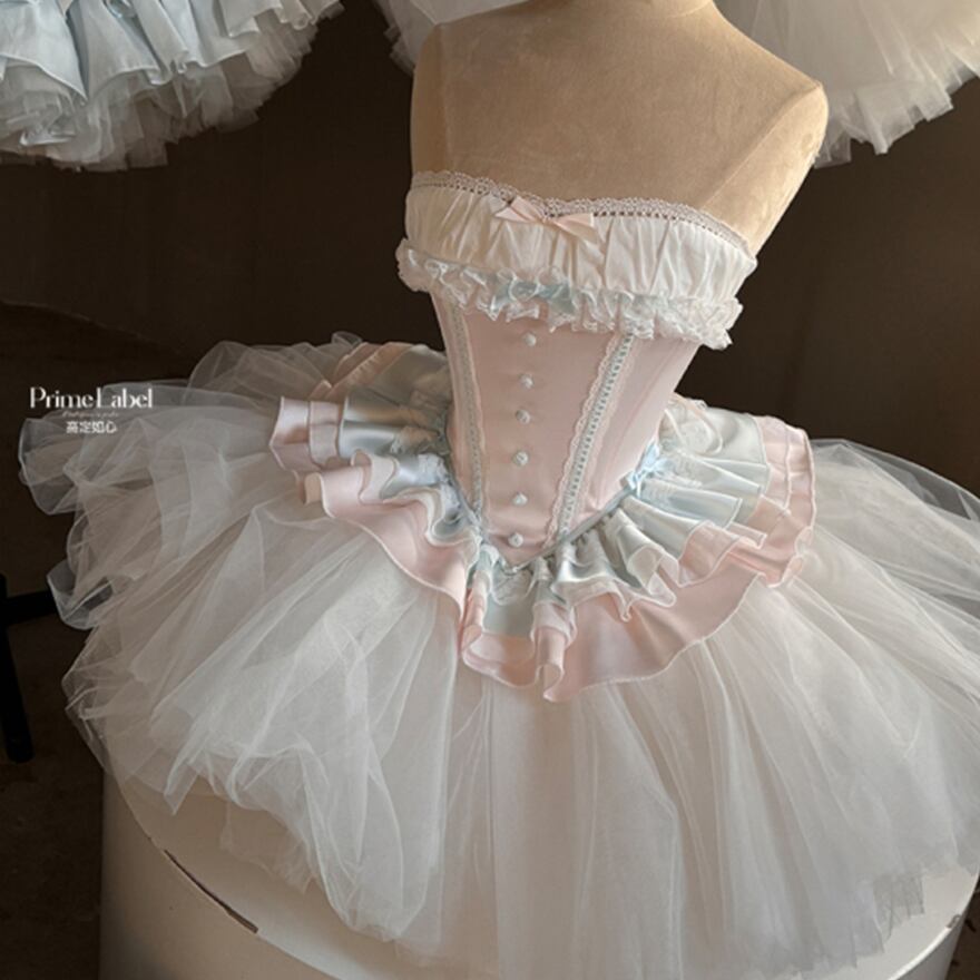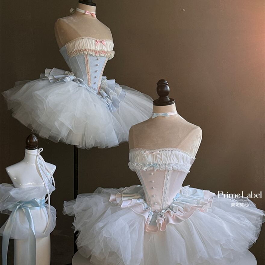ふんわりと何層にも広がるチュールとスカートのシルエット、そしてコルセットデザインが、上品でドーリーな印象を与えます。