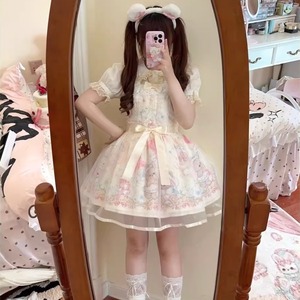 夢かわいい ロリィタ セットアップ ブラウス ジャンパースカート 生成色 ピンク プリント柄