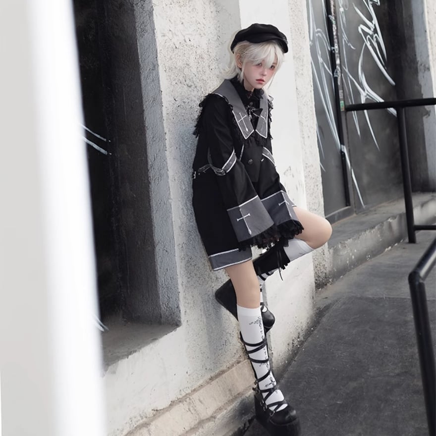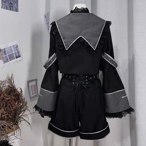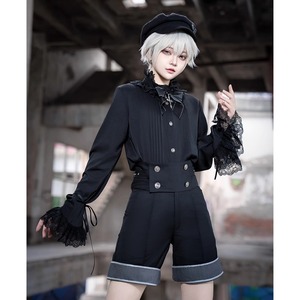 シャープなシルエットと装飾的なディテールが魅力の、ゴスロリ王子系・男装コーディネートにぴったりのジャケットにブラウス、ハーフパンツ、帽子の4点フルセットです。