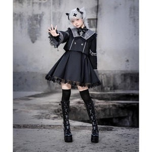 シャープなシルエットと装飾的なディテールが魅力の、ゴスロリ王子系・男装コーディネートにぴったりのジャケットとワンピース、帽子の3点フルセットです。