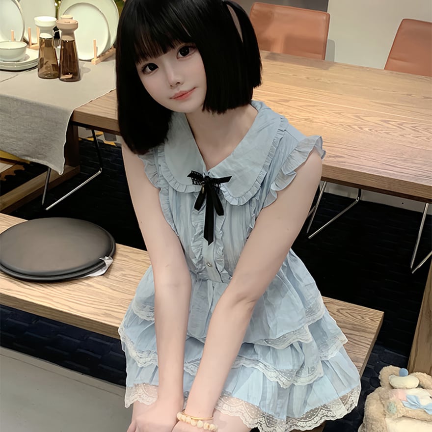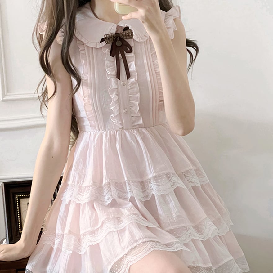 ふんわりと広がるティアードスカートのシルエットと、襟元のリボンが、ドーリーな雰囲気を演出します。