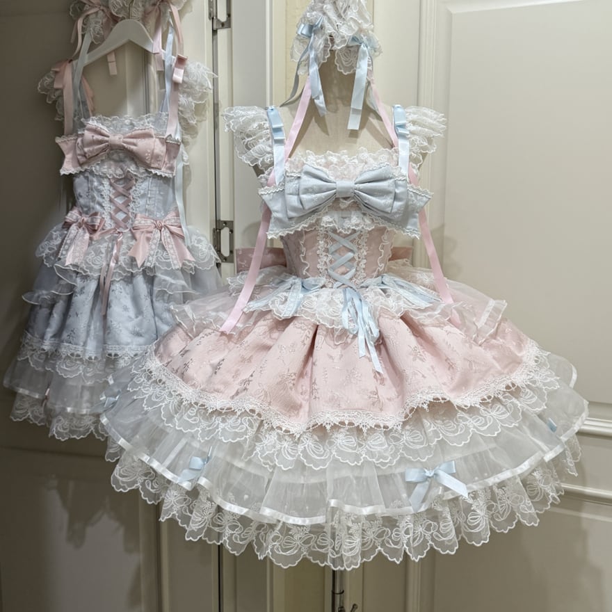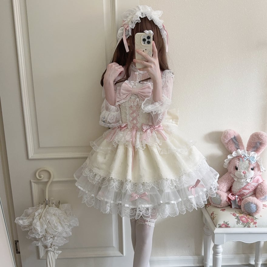 ふんわりと広がるティアードスカートのシルエットと、胸元や肩紐にあしらわれたリボンが、可憐でドーリーな印象を与えます。