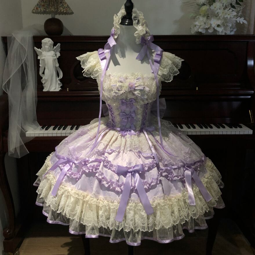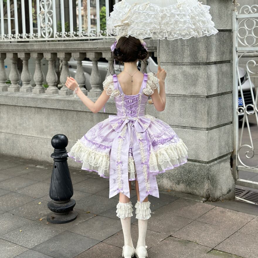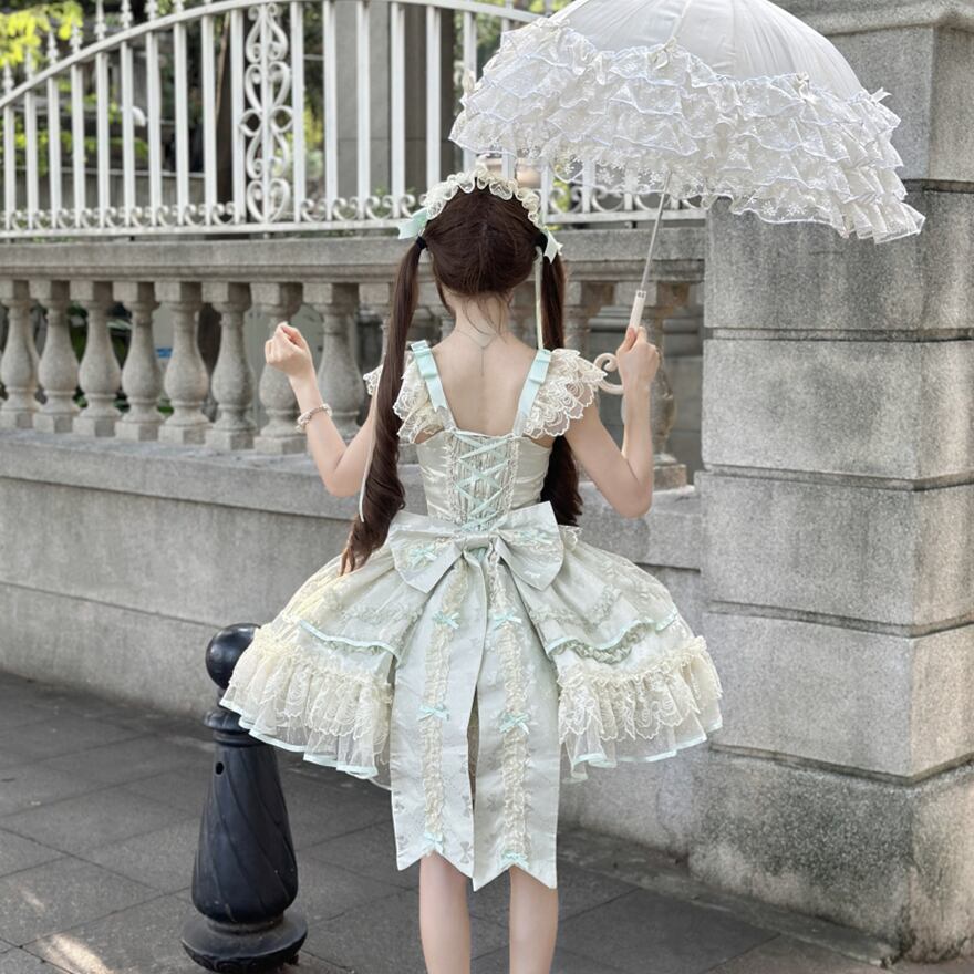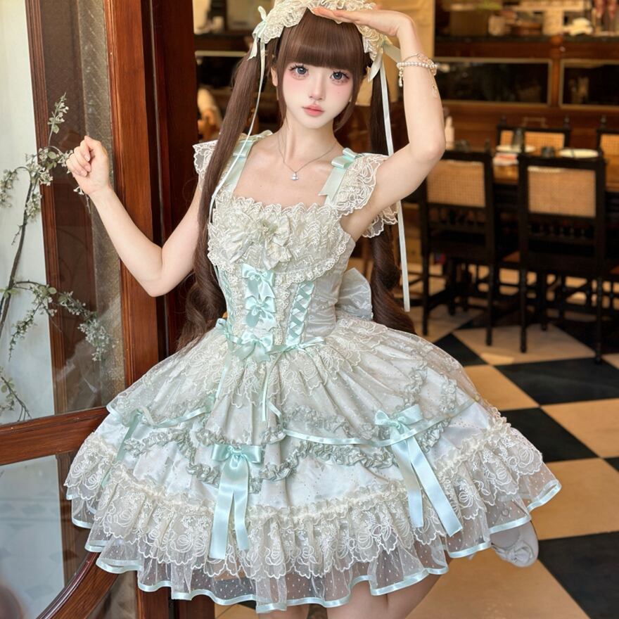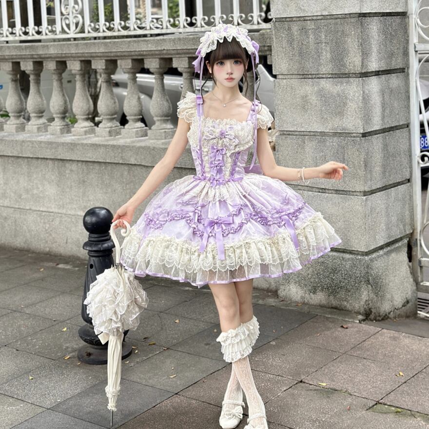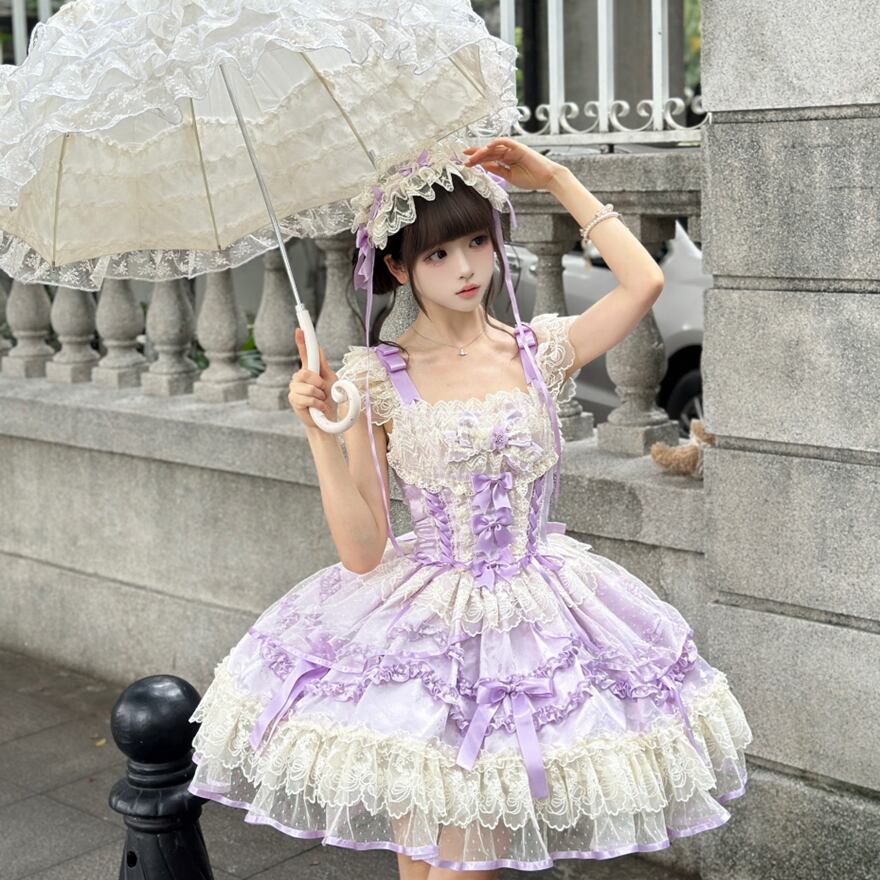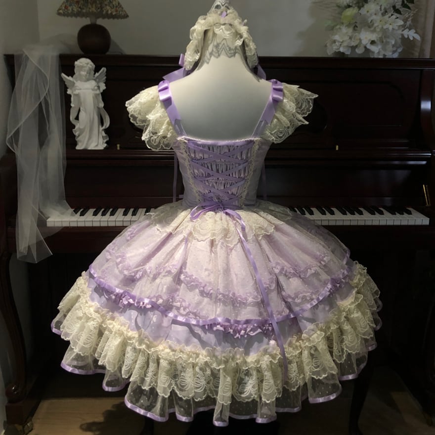淡いパープルとミントグリーンの2色展開の、幾重にも重ねられたフリルとレースが華やかな甘ロリ系のジャンパースカートです。