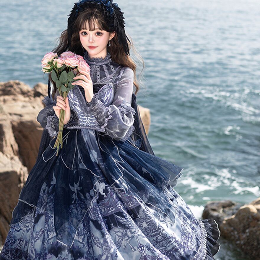 深いネイビーとホワイトのグラデーションが美しい、クラシカルなロリータファッションのセットアップです。シースルーのブラウスと、繊細なプリントが施されたJSK(ジャンパースカート)、そしてその上に重ねるシフォンレイヤーが、幻想的でエレガントな雰囲気を醸し出しています。