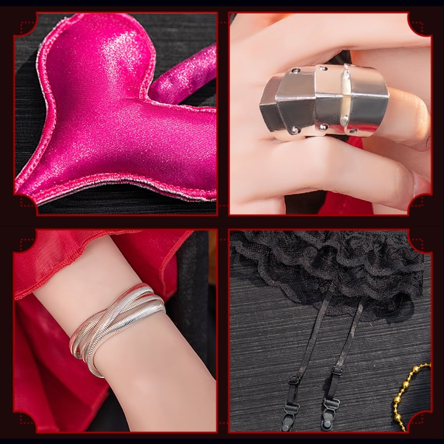 黒と赤のコントラストが目を引く、デビル風のコスプレ衣装です。袖カバー、ワンピース、しっぽ、骨、指輪、悪魔風カチューシャ、かぼちゃ飾り、ガーターベルト、黒ストッキング、チェーンの豪華セット。