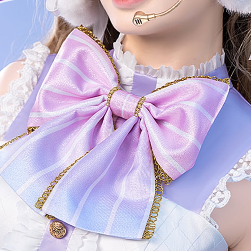 コスプレ衣装 : 背後リボン、襟リボン、腕飾り、上着、スカート、ヘッドセット(耳マイク道具)、脚飾り、脚リボン帯、腰花、後ろ腰花、髪飾り×2、髪花×2、腰チェーン、毛玉ヘアピン