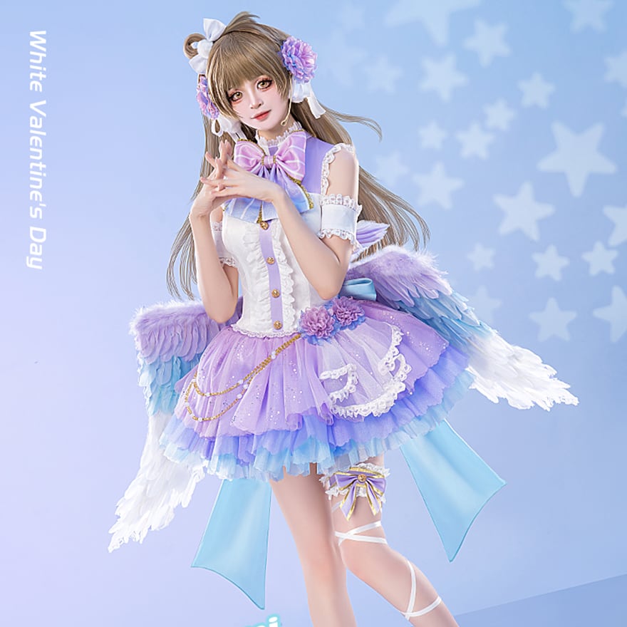 淡いパープルと水色のグラデーションが目を引く、ラブリーなコスプレ衣装です。