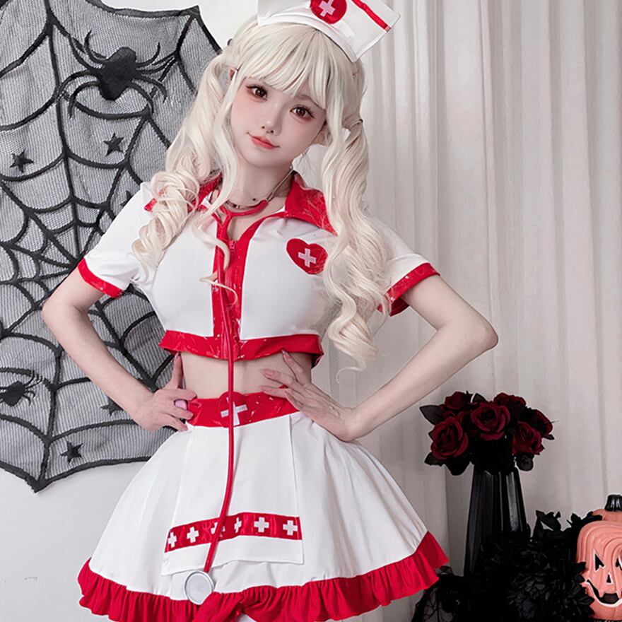 白と赤のコントラストが目を引く、ミニ丈のセクシーなナースコスプレ衣装です。