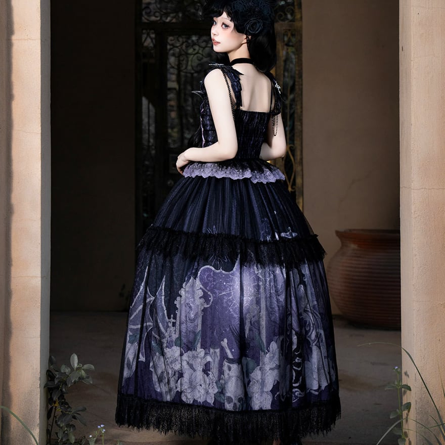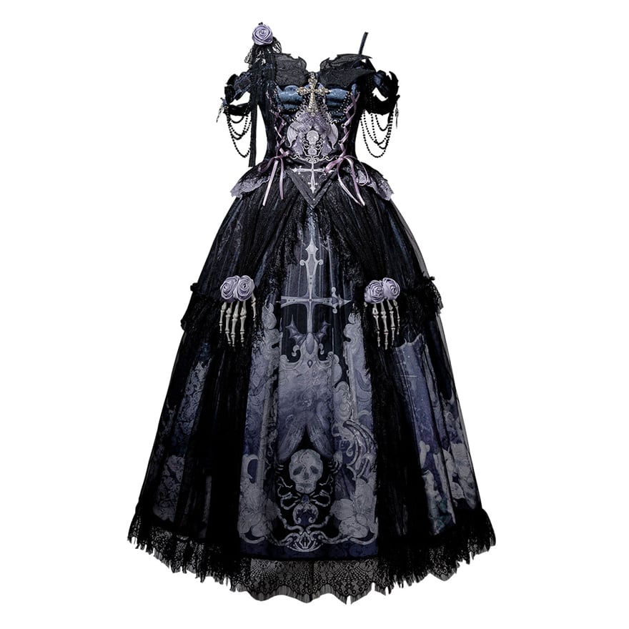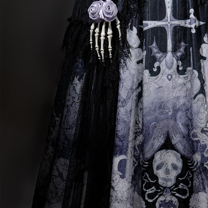 トップスは、十字架や鎖、骸骨の手などのモチーフが施され、スカートには墓地やコウモリ、蜘蛛の巣などが繊細なプリントで表現されています。
