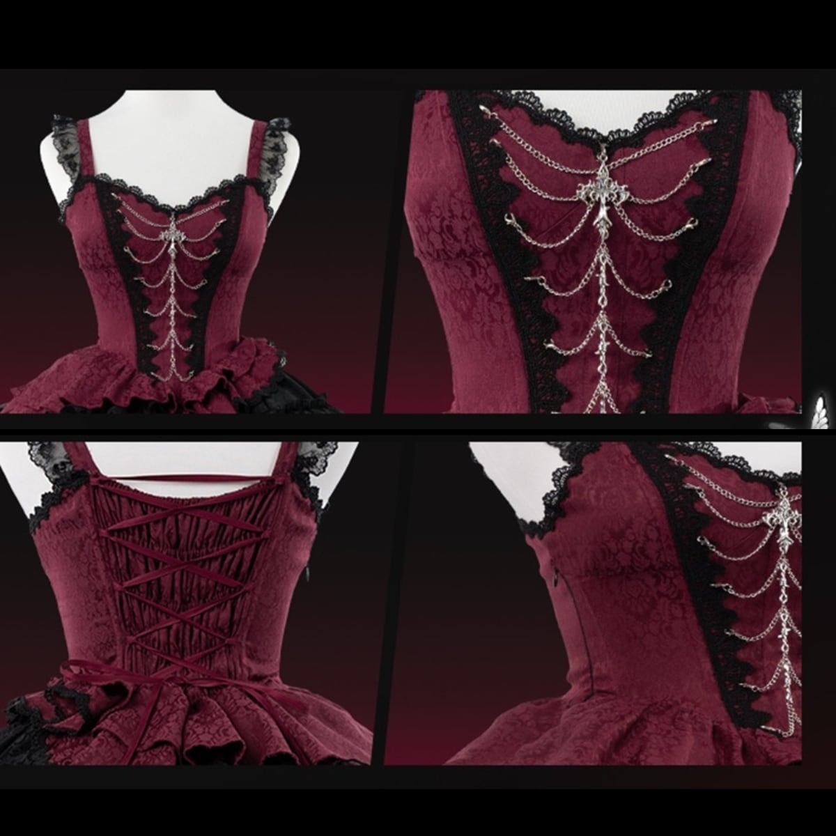 深みのあるワインレッドと漆黒のブラックの生地に、レースやフリル、チェーンがふんだんにあしらわれた、ゴスロリのジャンパースカートです。