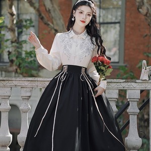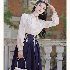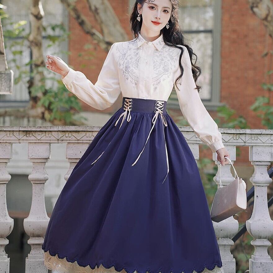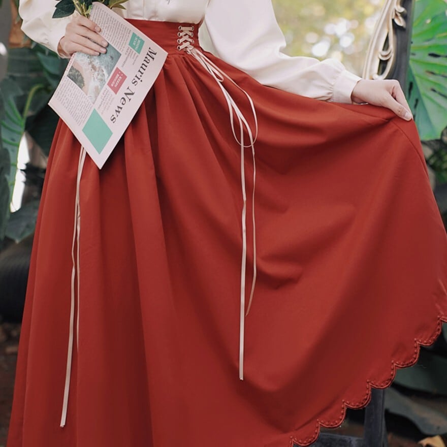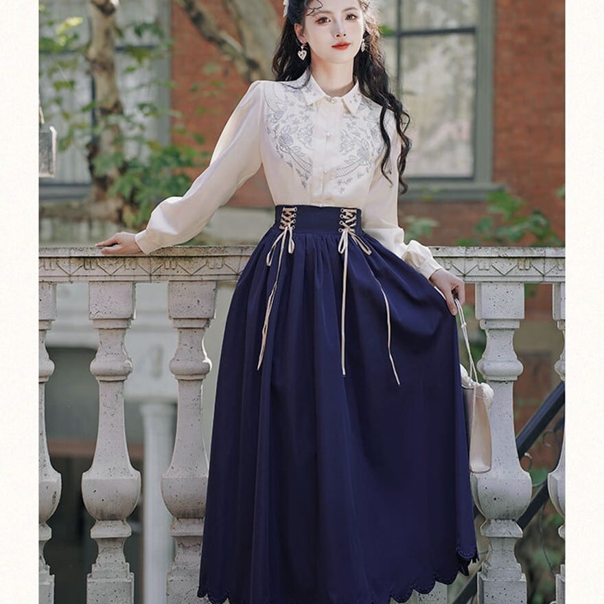 シンプルな長袖ブラウスと、レースアップのロングスカートのセットアップです。