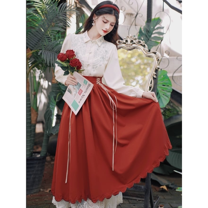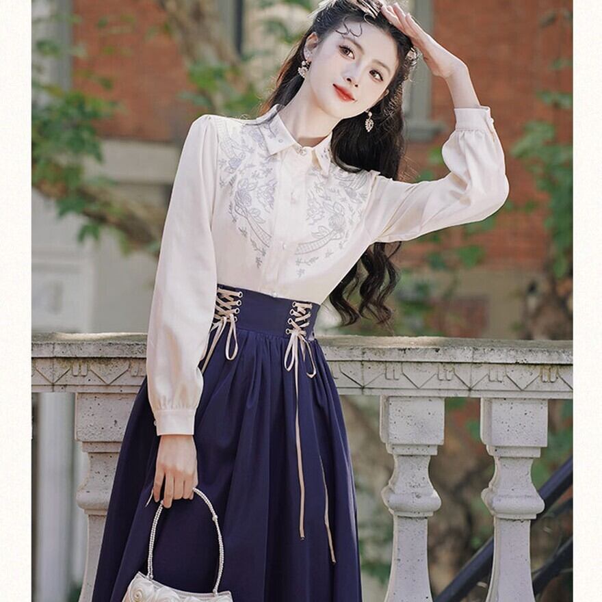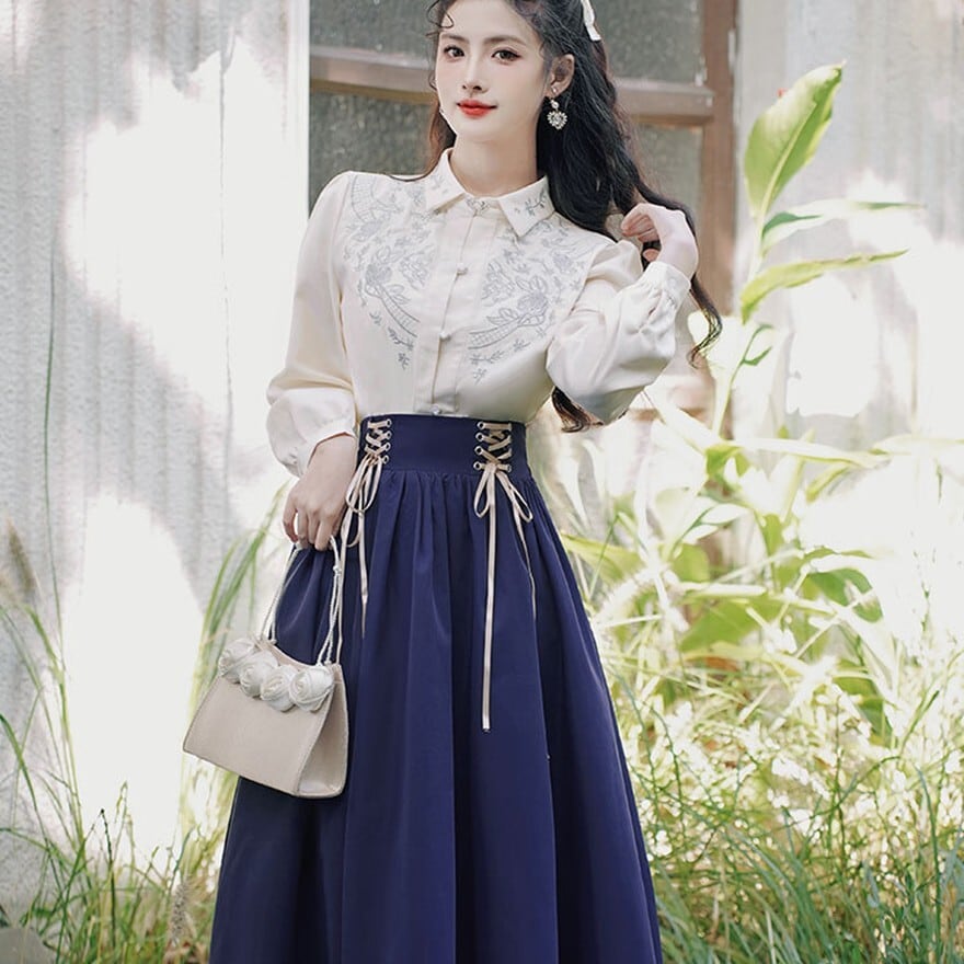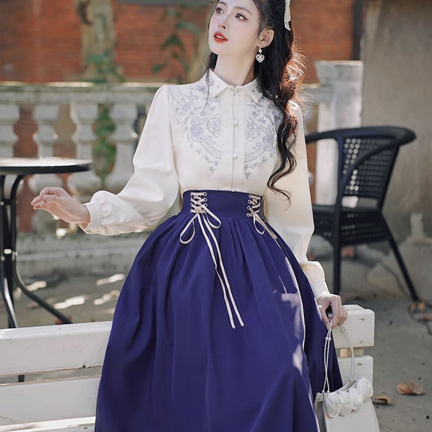 ブラウスはホワイトの生地に、襟元や胸元に繊細な刺繍が施されており、清楚で上品な印象を与えます。