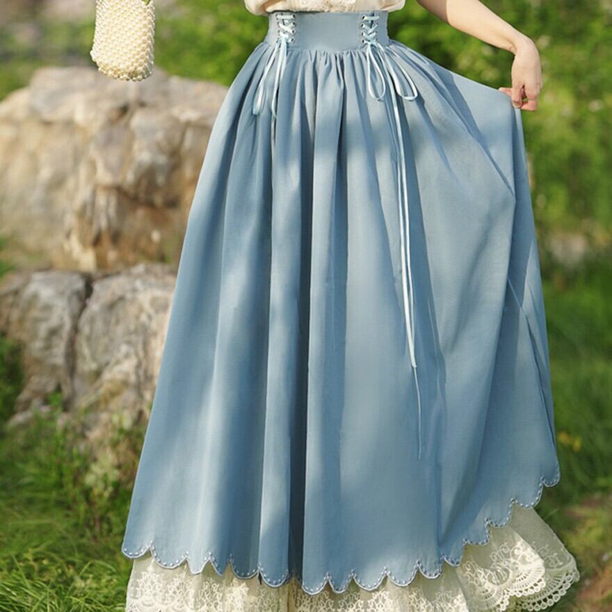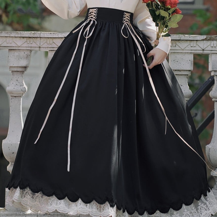 スカートはブラック、ワインレッド、ネイビー、ブルーの4色展開で、裾のレースと、ウエストのレースアップのデザインが特徴的です。