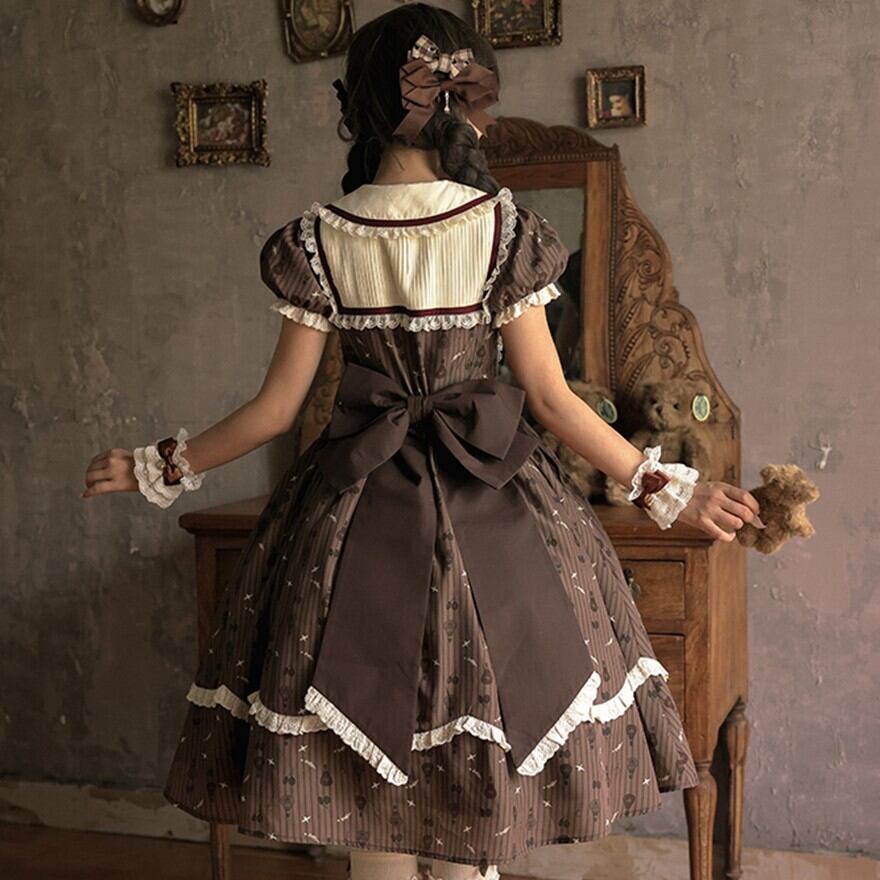 ブラウンの生地に、オフホワイトの繊細なレースが襟元、袖、裾にあしらわれた、クラシカルロリータのワンピースです。