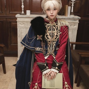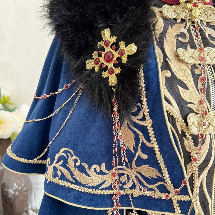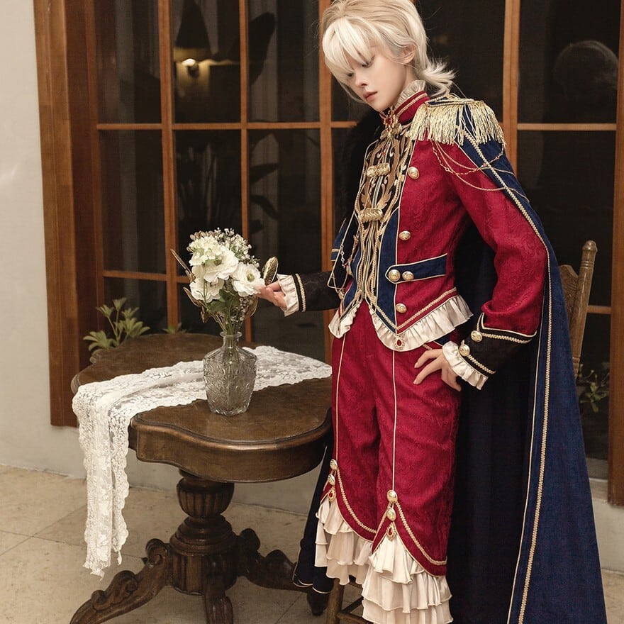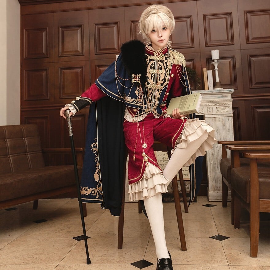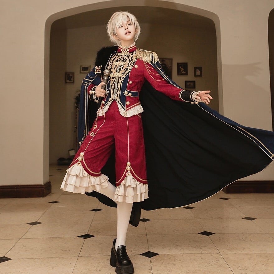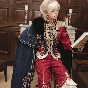鮮やかな赤と紺の生地に、ゴールドの刺繍や飾緒が施された、王子ロリータのセットアップです。