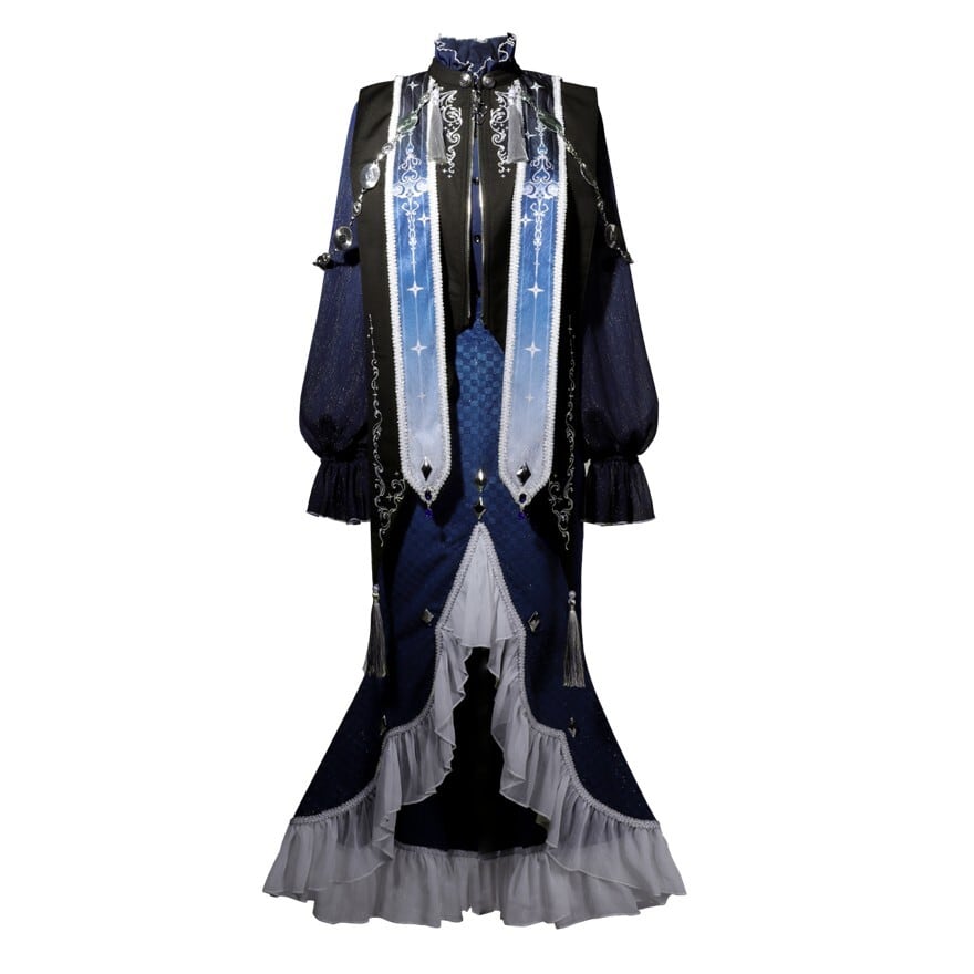 ショール、スカート、上着の3点セットで、重厚感とエレガントさが共存するデザインが特徴。