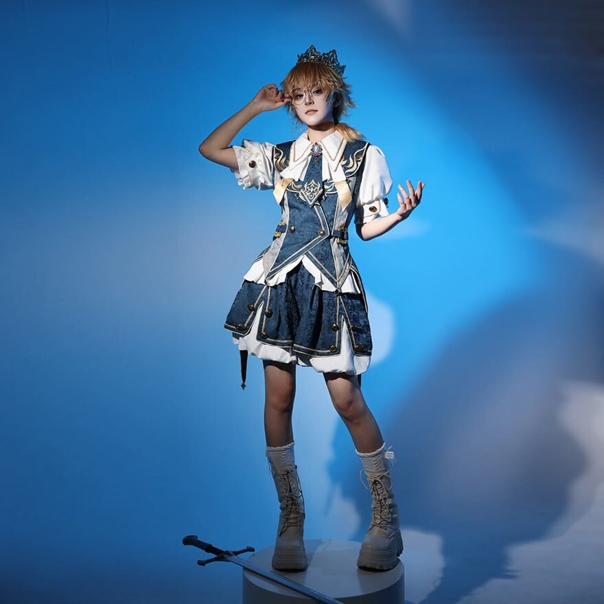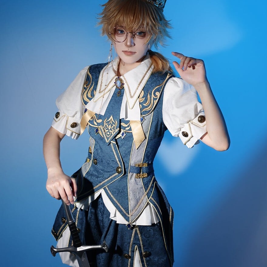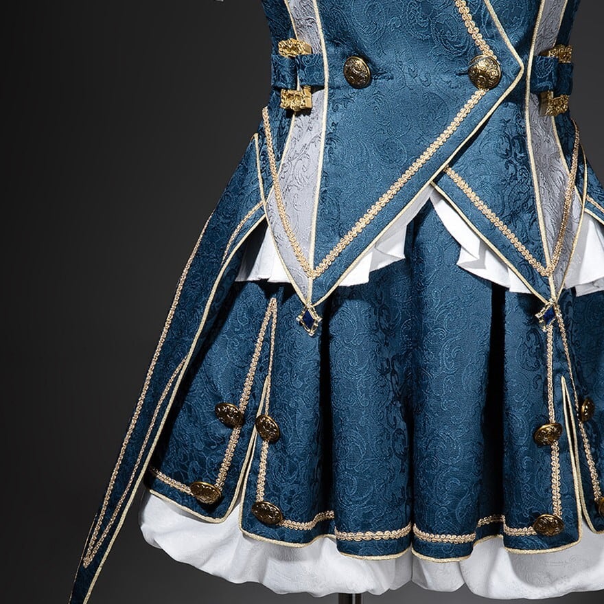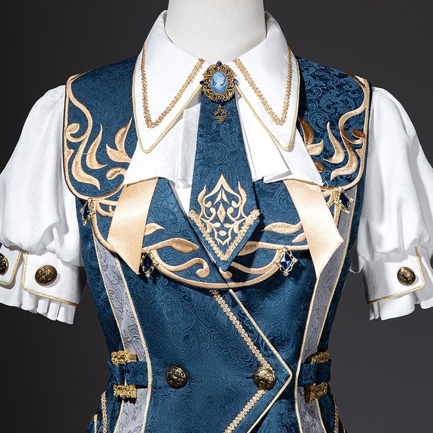 ダークブルーの生地に、ゴールドの装飾やチェーンがあしらわれた、皇子系ロリータのセットアップです。
