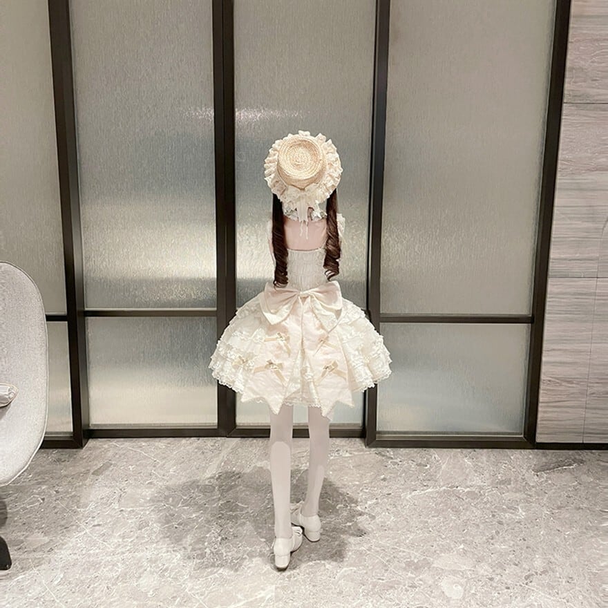 ふんわりと広がるスカートの後ろ姿を飾るのは、存在感のある大きなリボン。
