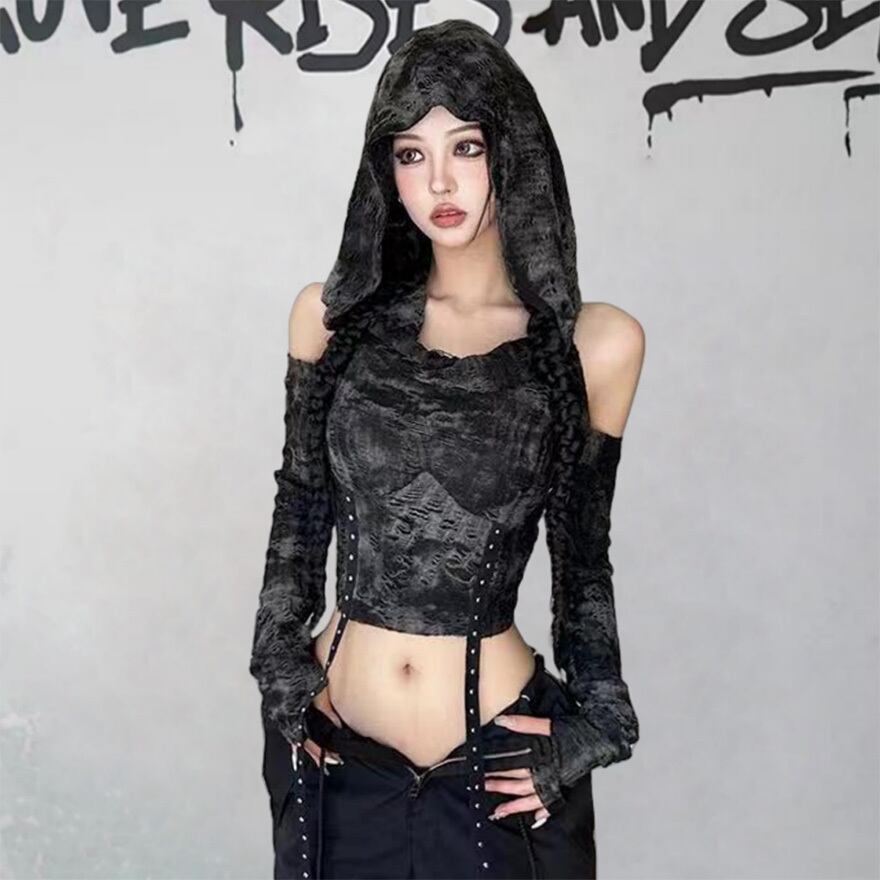 関連キーワード: #サブカル #地雷系 #Y2K #グランジ #ゴシック #サイバーパンク #フェアリーグランジ #長袖 #クロップド丈 #パーカー #フード #肩あき #オープンショルダー #肌見せ #病みかわ #ストリートファッション