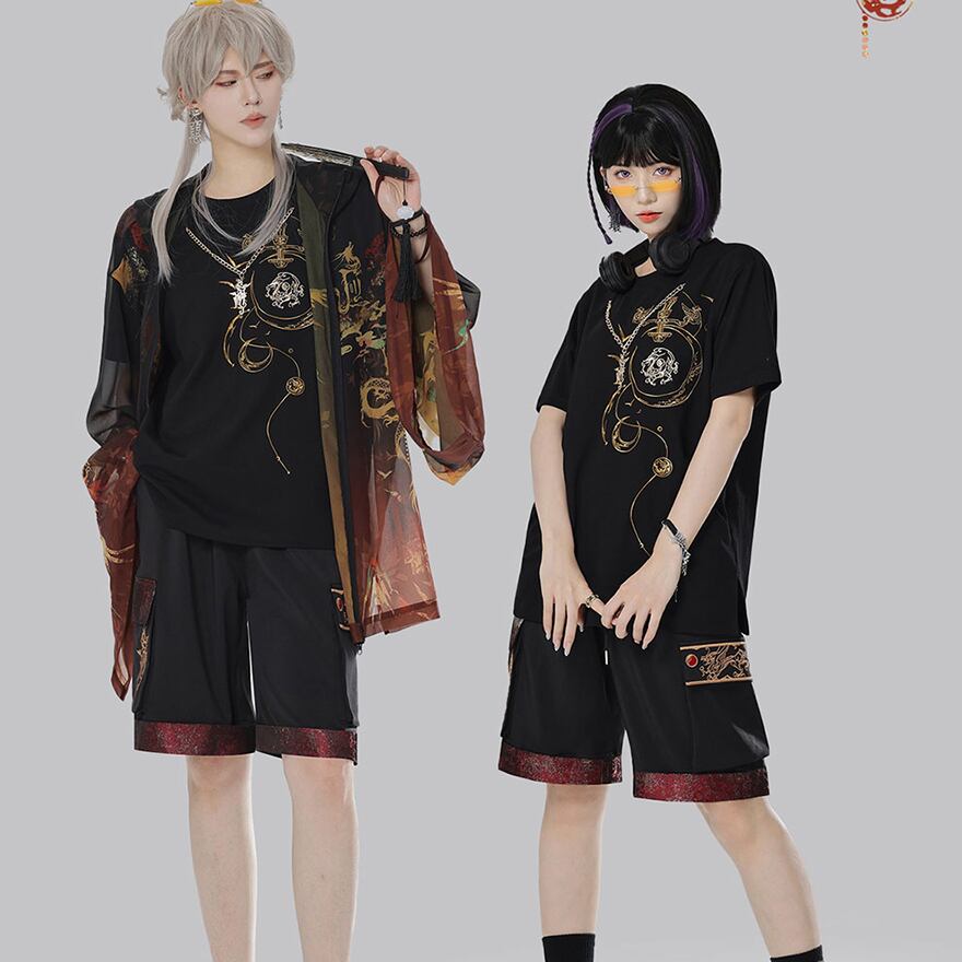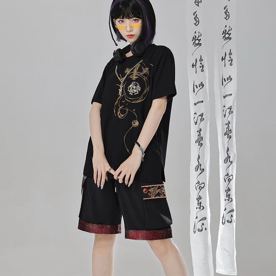 中華ゴシック ハーフパンツ ユニセックス 刺繍 卿棠オリジナル 夏服 Y2Kファッション ストリートファッション