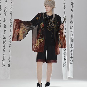 裾には光沢のある赤系のジャカード生地を組み合わせ、ダークなトーンの中に華やかさをプラス。男女問わず着用できるユニセックスなアイテムです。