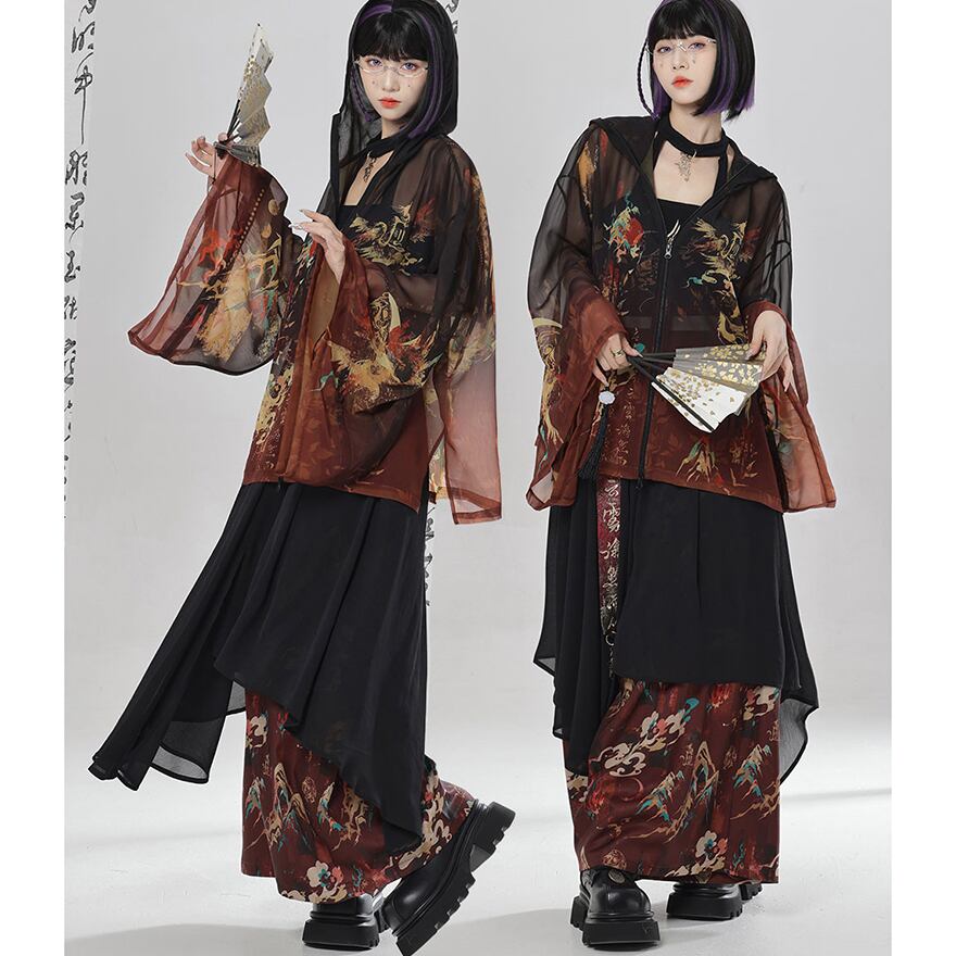 中華ゴシック カーディガン フード付き ユニセックス プリント柄 卿棠オリジナル 夏服 Y2Kファッション ストリートファッション