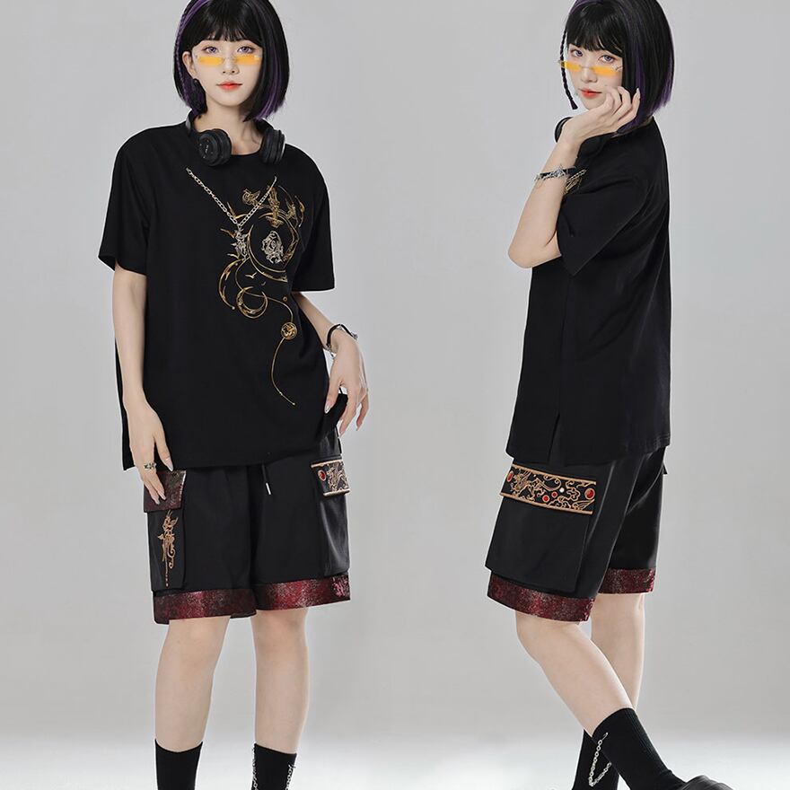 中華ゴシック Tシャツ 刺繍 卿棠オリジナル 夏服 Y2Kファッション ストリートファッション