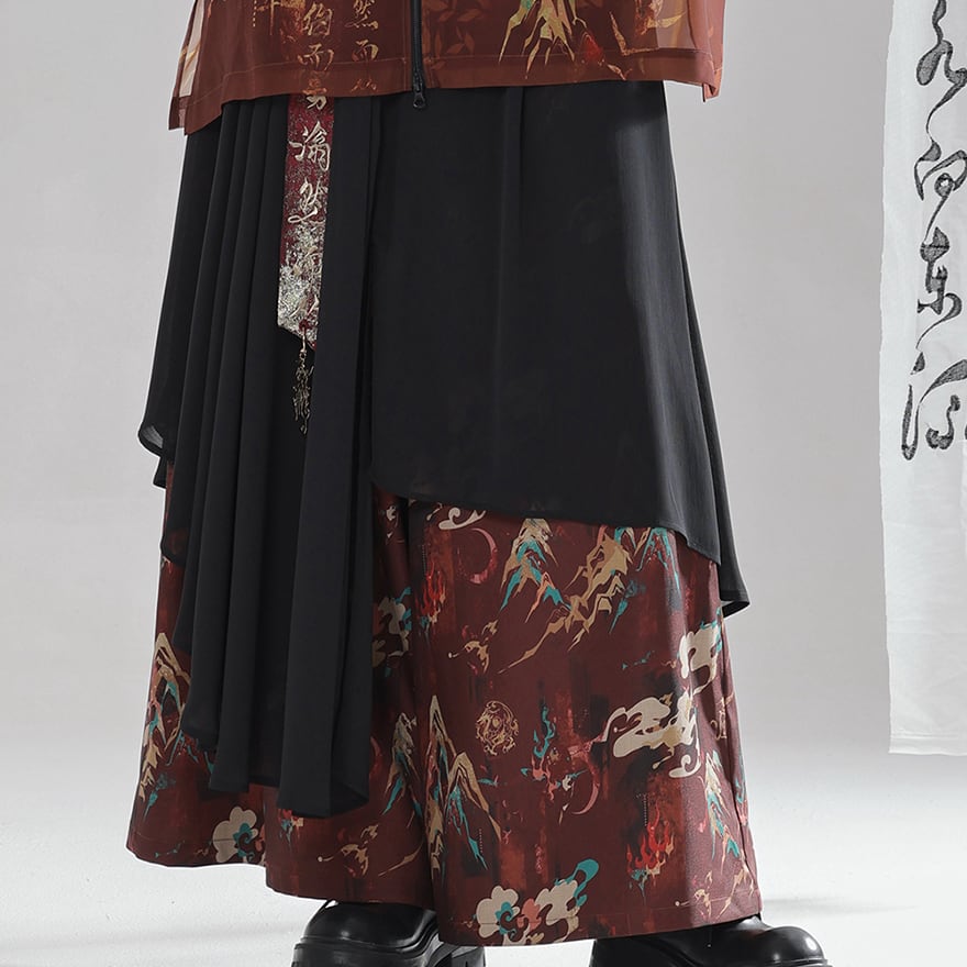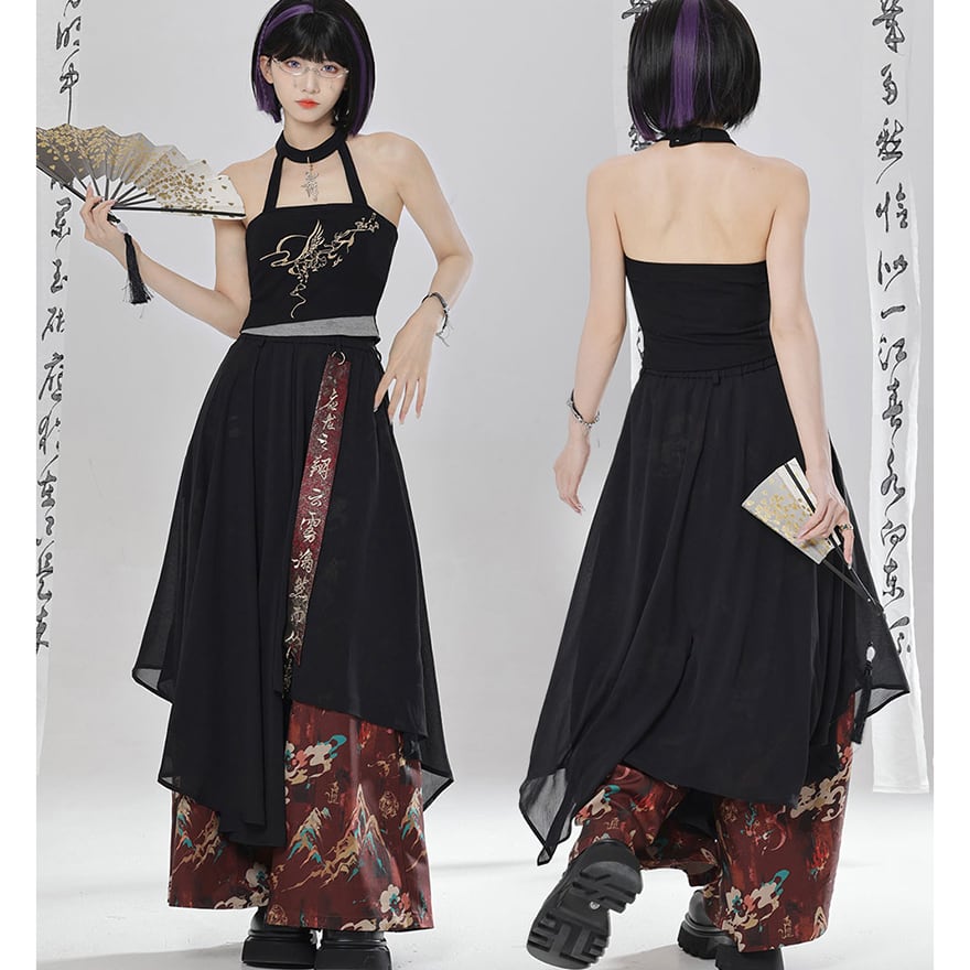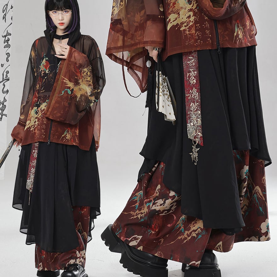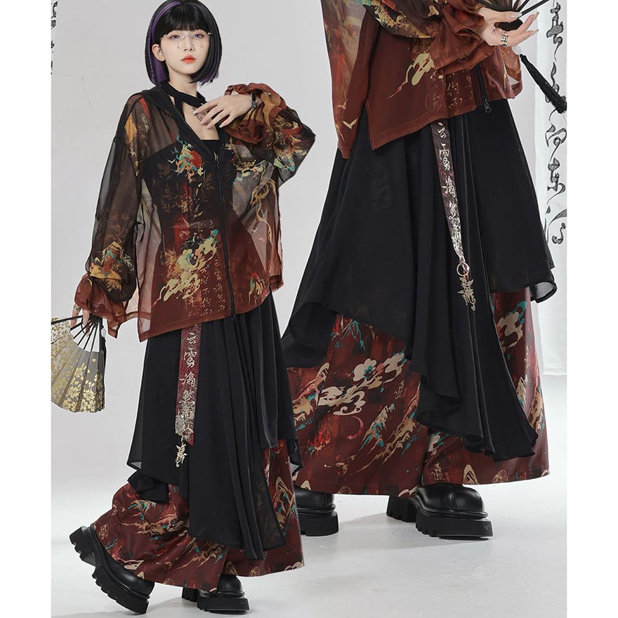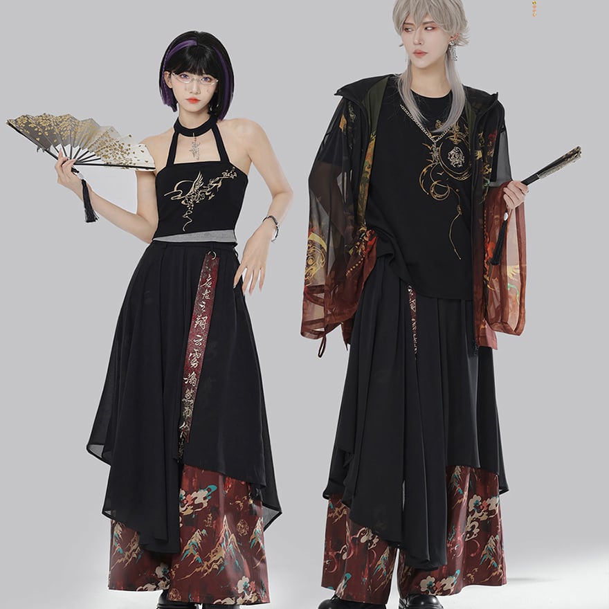 関連キーワード: #チャイナ風 #中華服 #ワイドパンツ #袴パンツ #ストリートファッション #Y2K #サブカル #モード系 #アシンメトリー #レイヤード #プリント #刺繍 #ユニセックス #男女兼用 #卿棠 #山海経 #個性的 #黒
