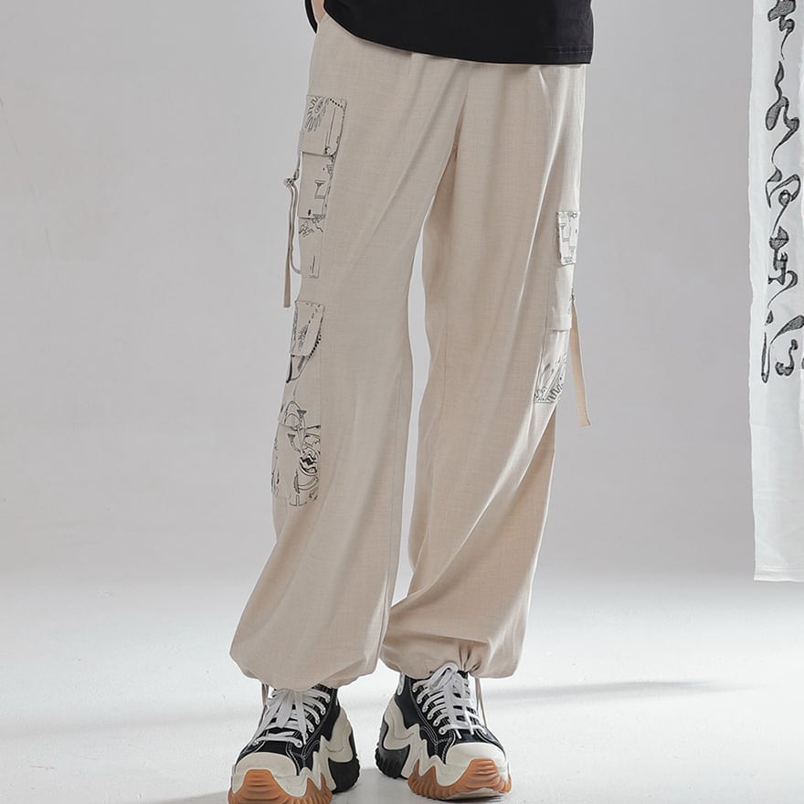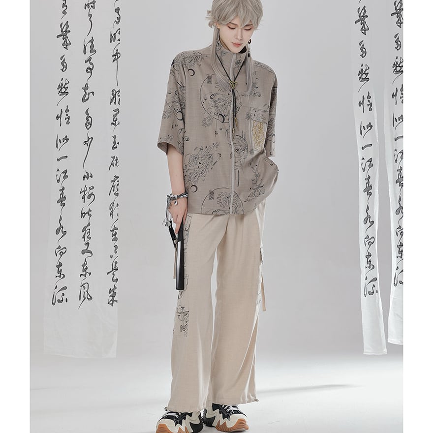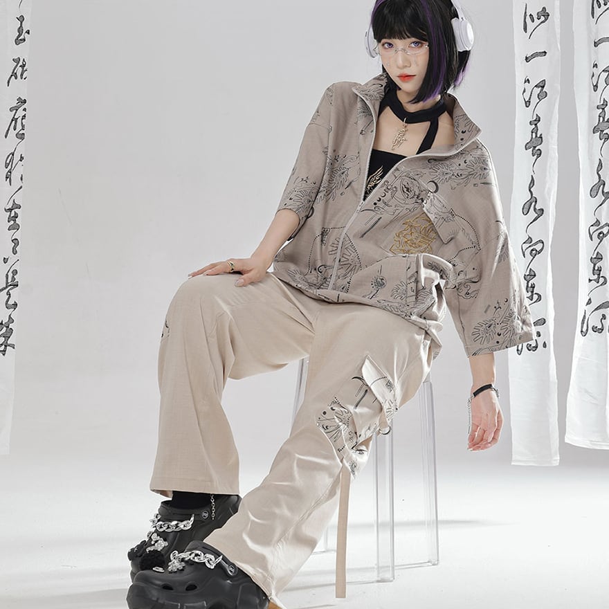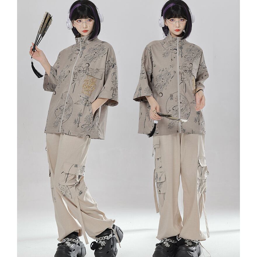関連キーワード: #チャイナ風 #中華服 #カーゴパンツ #ワイドパンツ #ジョガーパンツ #2WAY #ストリートファッション #Y2K #サブカル #プリント #ユニセックス #男女兼用 #卿棠 #個性的 #ベージュ #セットアップ
