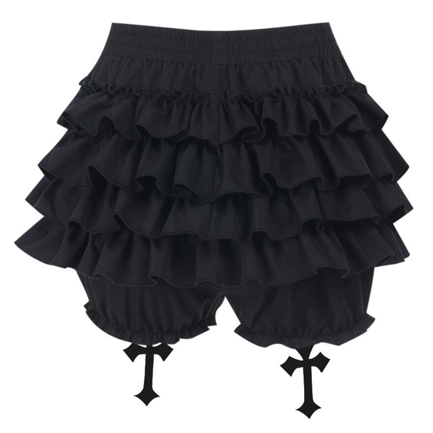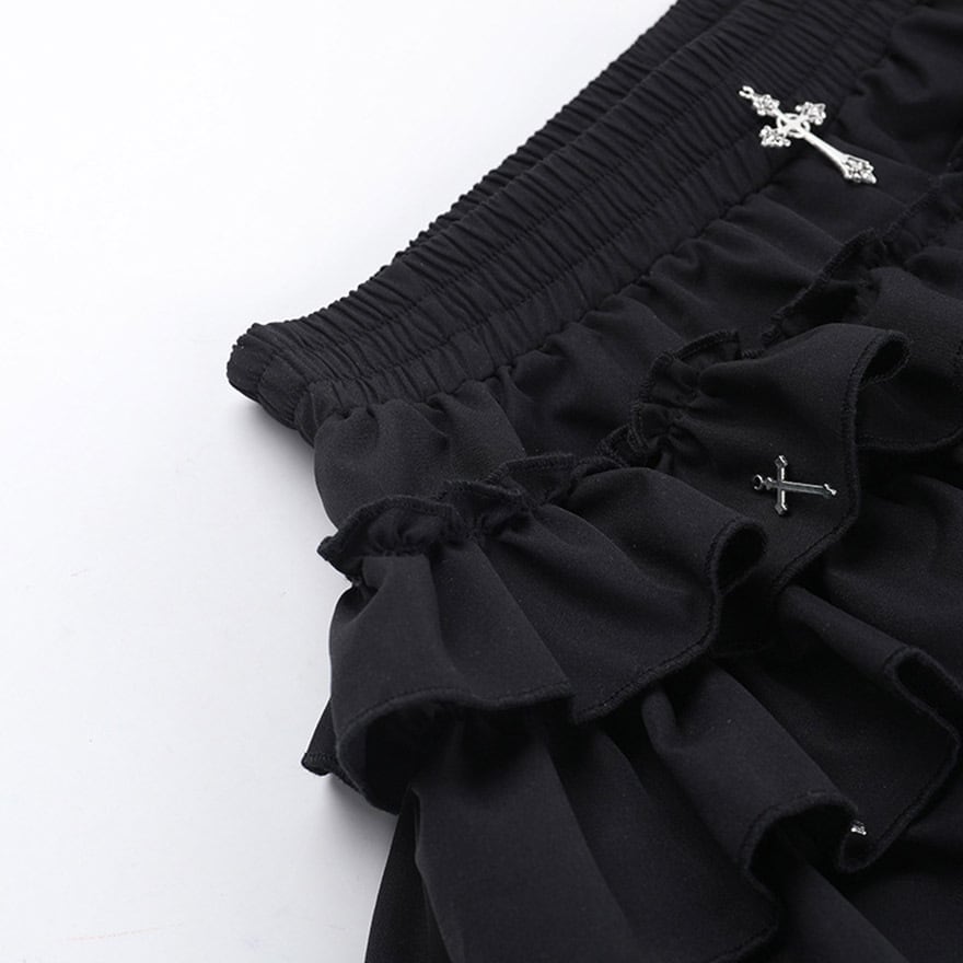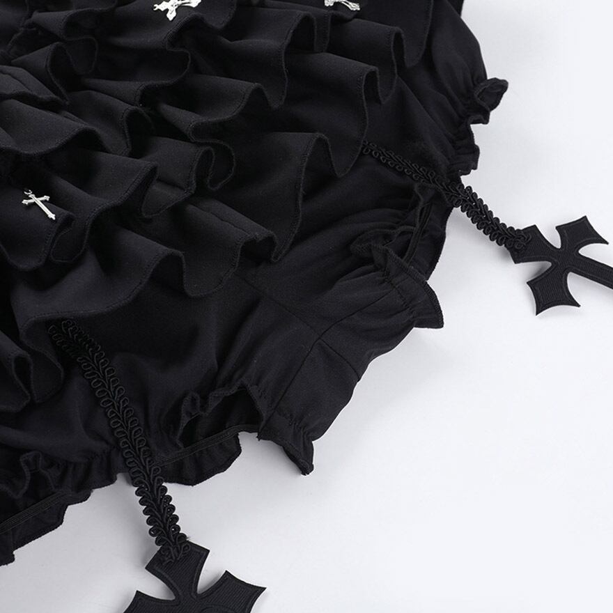 フリルには小さな十字架のチャームがさりげなくあしらわれ、ダークな雰囲気を演出。太ももにはガーターベルト風の大きな十字架飾りが付属しており、コーディネートのアクセントになります。インナーパンツ一体型なので、ミニ丈でも安心して着用いただけます。