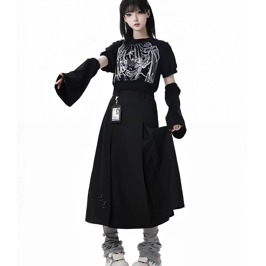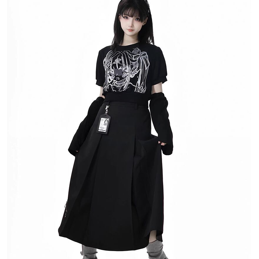 プリーツスカートやハーフパンツと合わせて王道の地雷・サブカルスタイルはもちろん、モデルのようにロングスカートと合わせてモードに着こなすのもおすすめです。