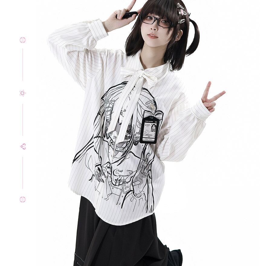 ゴスロリ通販 With U 地雷系 ホワイト シャツ ストライプ イラスト ストリートファッション pinksavior