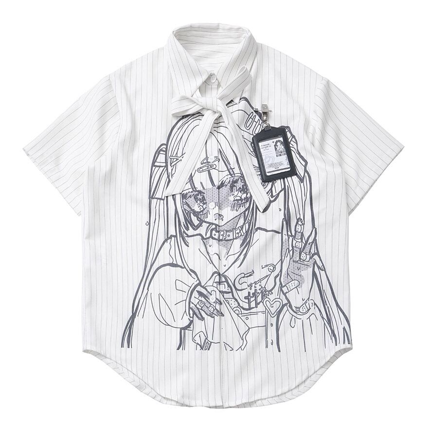 清潔感のあるストライプ柄の生地に、フロント全面に描かれたアンニュイな表情の少女のイラストがインパクト抜群な半袖シャツです。
