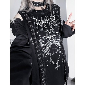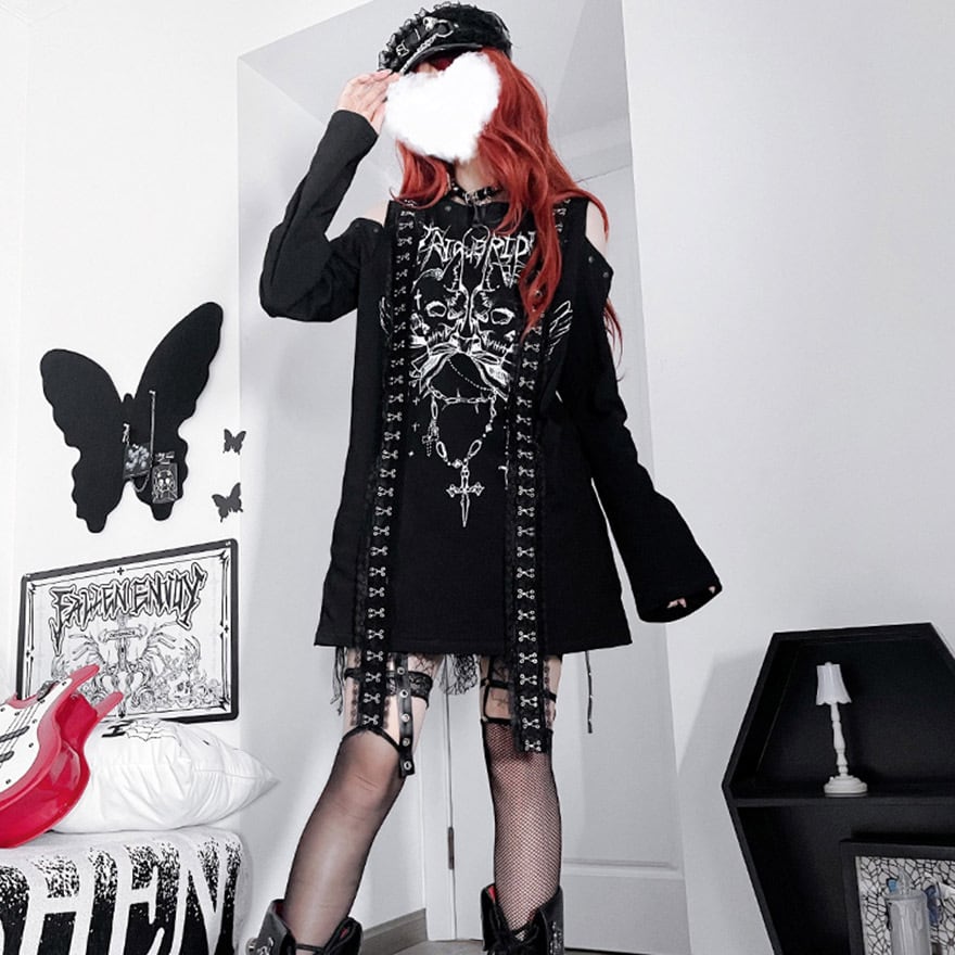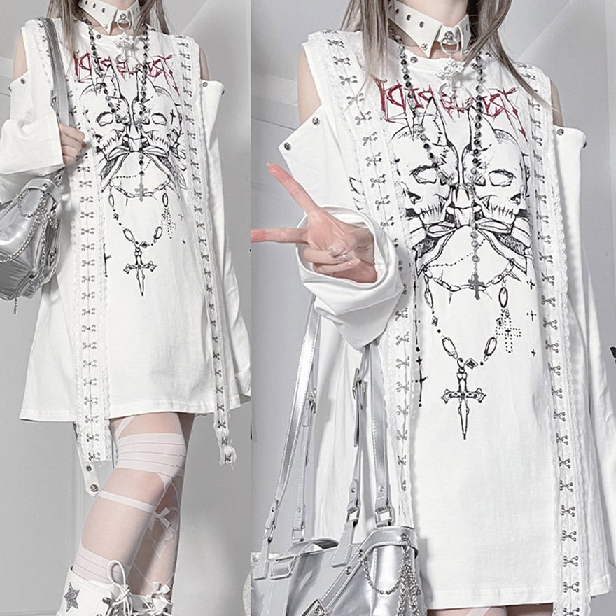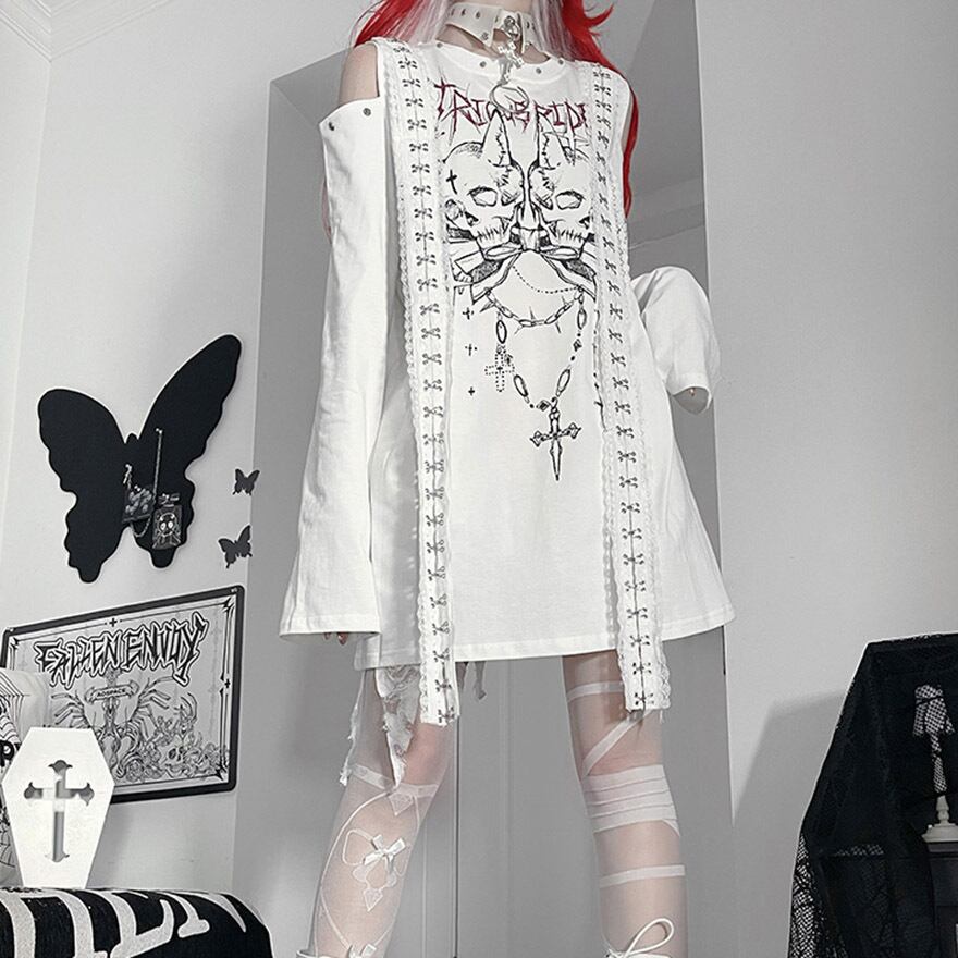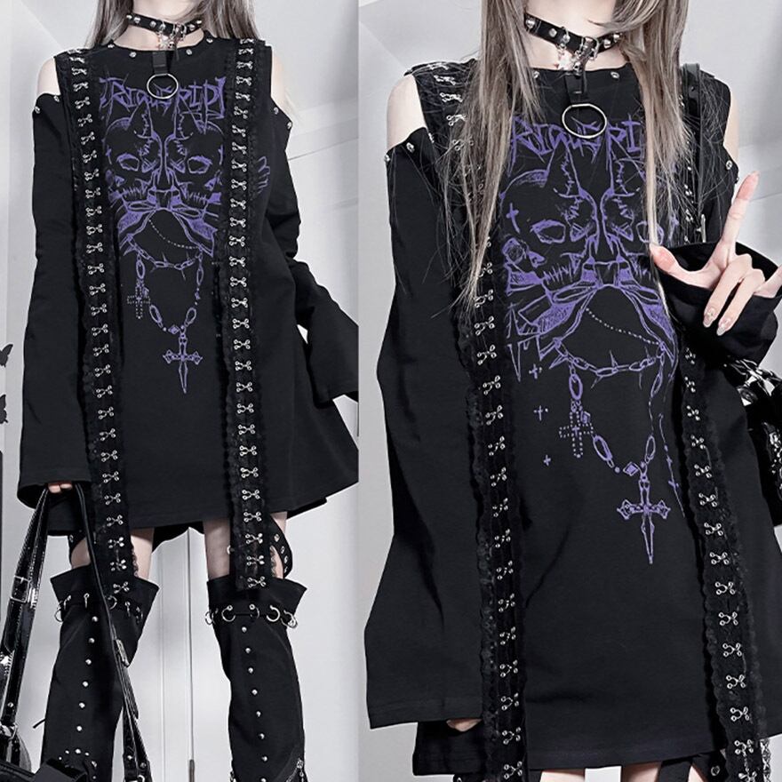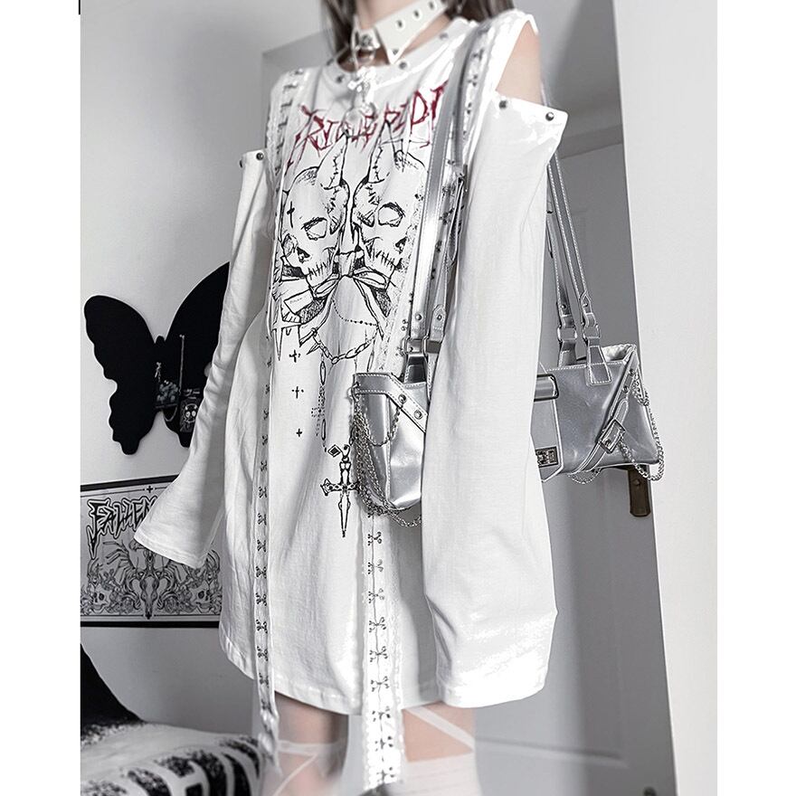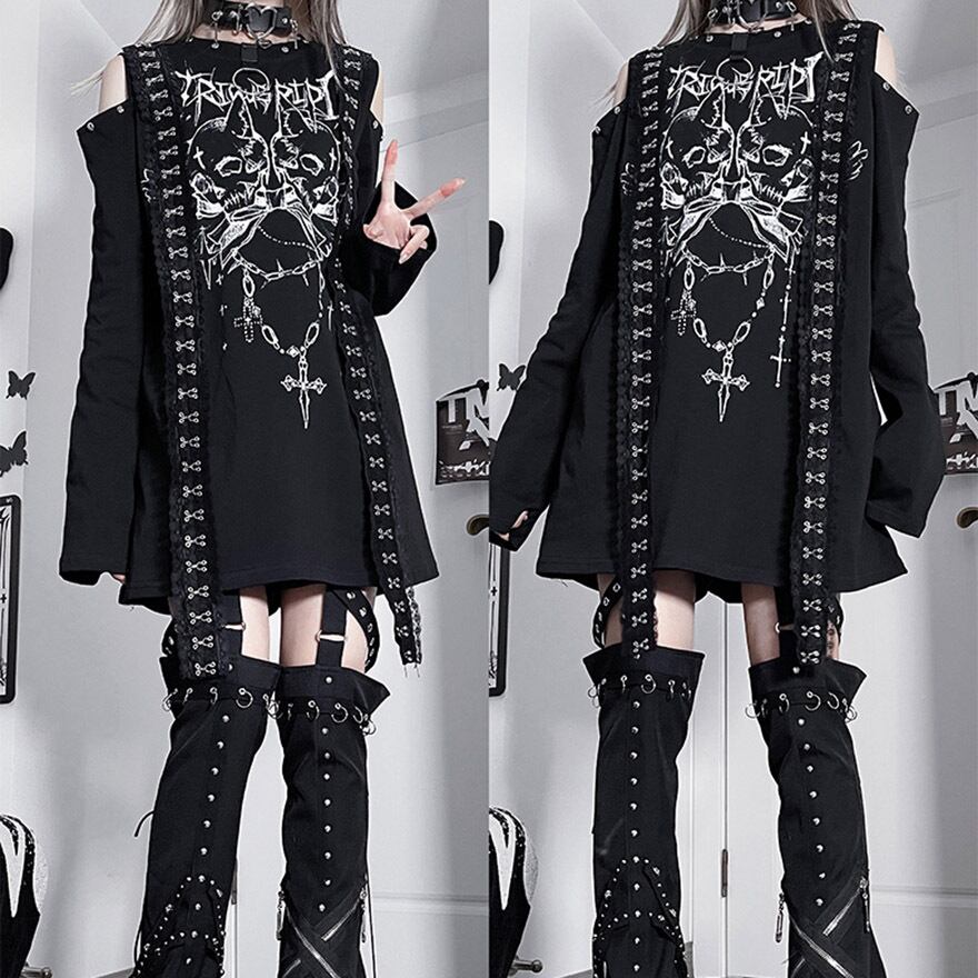 関連キーワード: #サブカル #地雷系 #ストリートファッション #Tシャツワンピ #オープンショルダー #長袖 #スカル #ゴシック #パンク #病みかわいい #個性的 #ロングTシャツ #モノトーン
