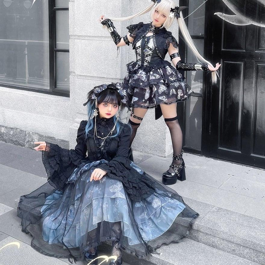 ゴシックなコルセットデザインと、儚げな蝶々プリントの組み合わせが唯一無二の世界観を演出。