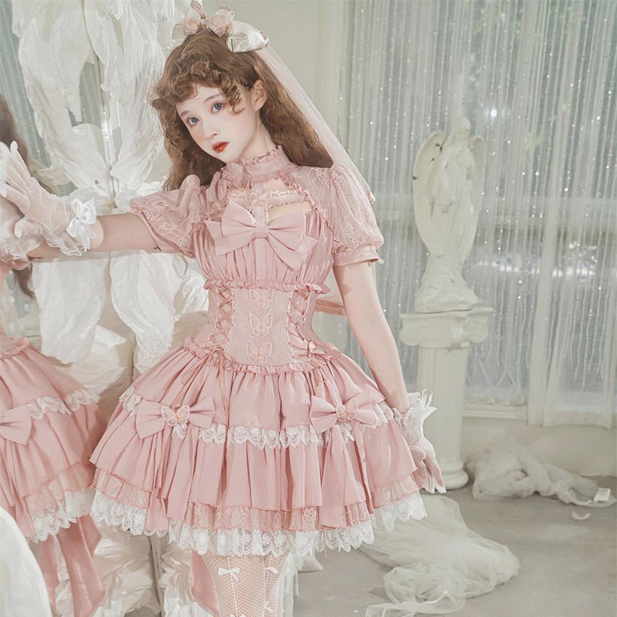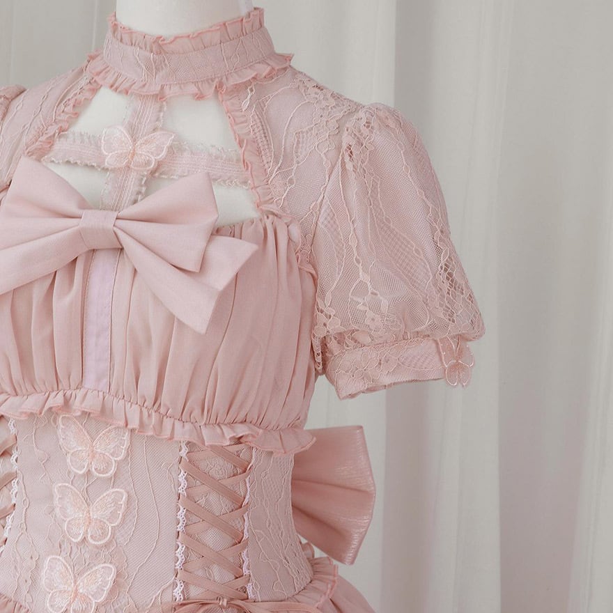 ゴスロリ通販 With U ロリィタドレス ワンピース ピンク 半袖 レースアップ リボン 甘ロリ