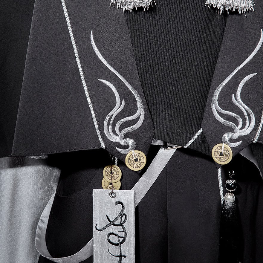 アシンメトリーなトップス、チャイナボタンが特徴的なハーフパンツ、そして八卦を模した刺繍が施されたミステリアスな羽織りがセットになっています。