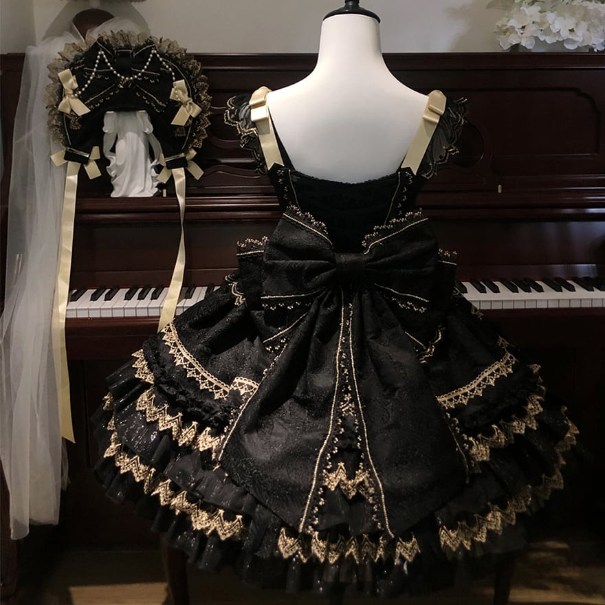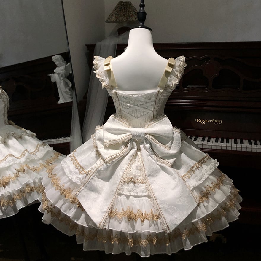 ゴールドのブレードレースやパールチェーン、幾重にも重なるフリルとリボンをふんだんにあしらった、最高に豪華なプリンセスドレスです。