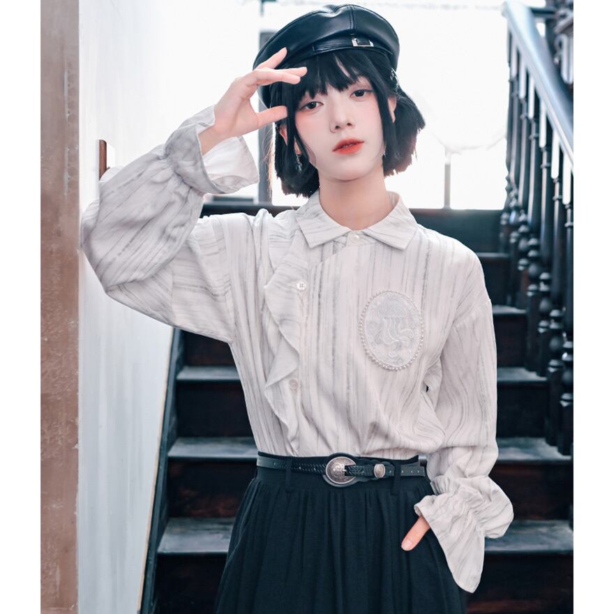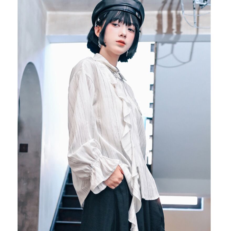 関連キーワード: #チャイナ #中華風 #チャイナシャツ #サブカル #モード #ブラウス #長袖 #アシンメトリー #フリル #刺繍 #ストライプ #個性的 #白シャツ #参戦服