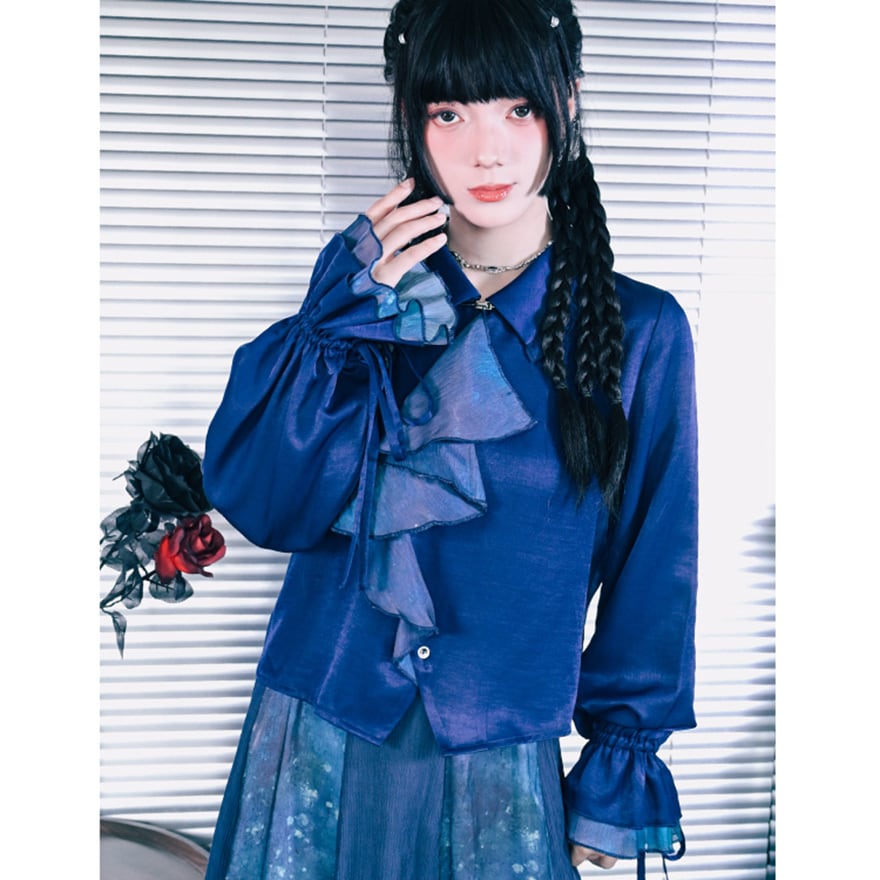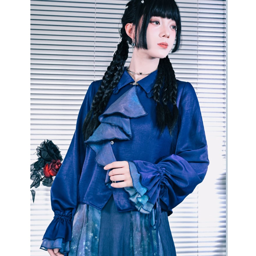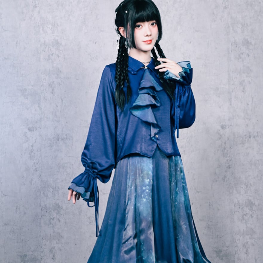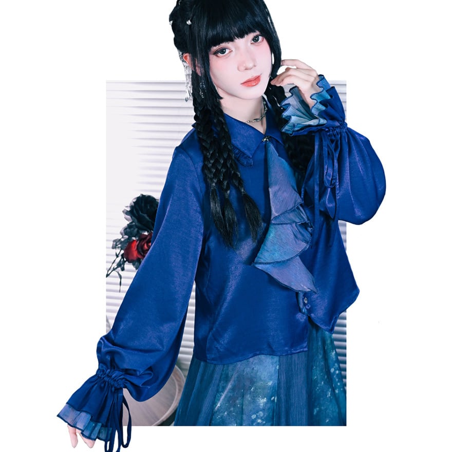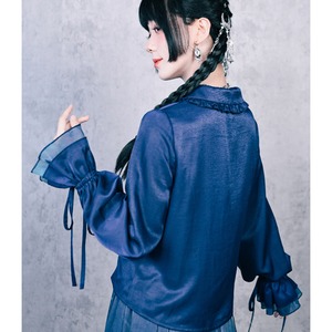 関連キーワード: #チャイナ #中華風 #チャイナブラウス #地雷系 #サブカル #ゴシック #ブラウス #長袖 #フリル #ランタンスリーブ #青 #ブルー #個性的 #参戦服