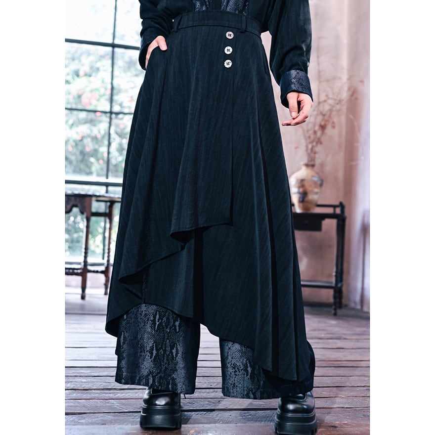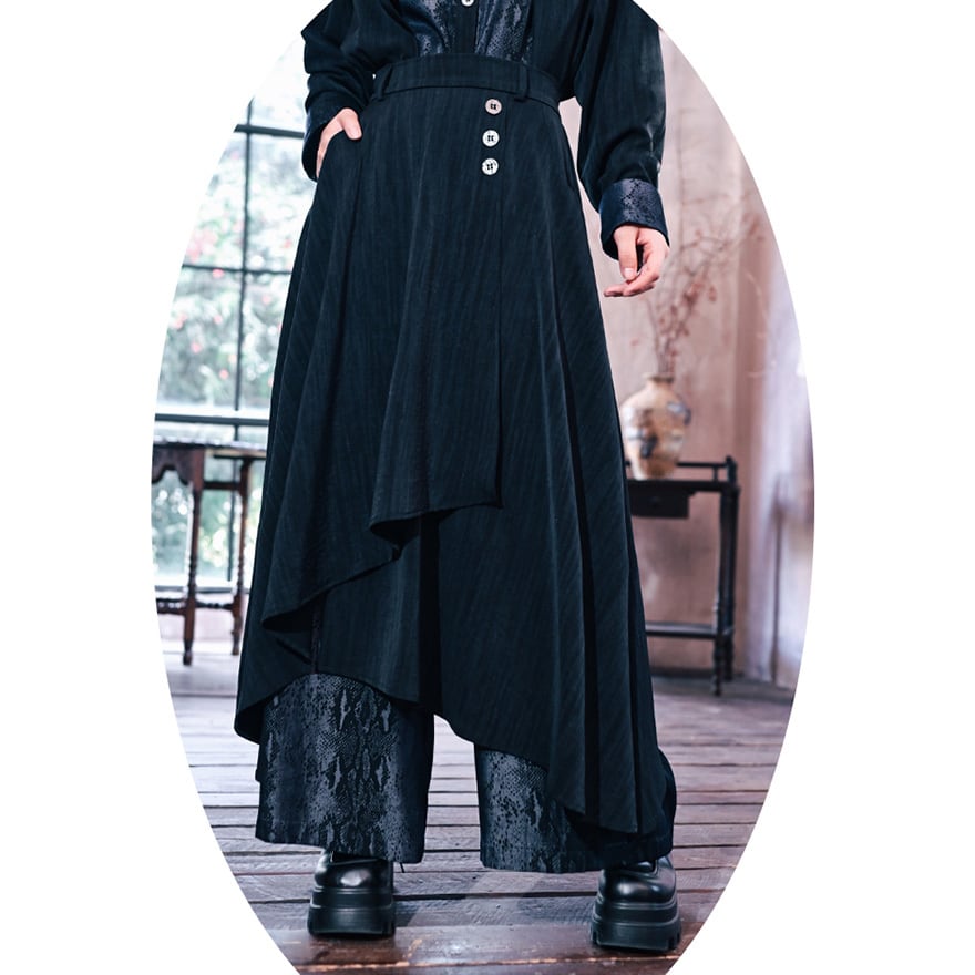 関連キーワード: #チャイナ #中華風 #チャイナパンツ #サブカル #モード #ゴシック #ワイドパンツ #袴パンツ #レイヤード #アシンメトリー #蛇柄 #パイソン柄 #個性的 #ユニセックス #黒 #ブラック #参戦服