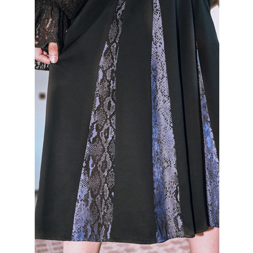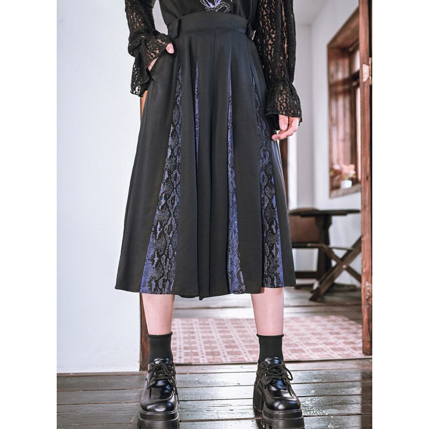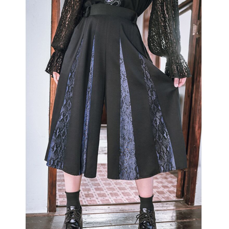 一見するとシンプルな黒のプリーツスカート、しかしその奥にはミステリアスな蛇柄が隠された、ギミックの効いたワイドパンツです。